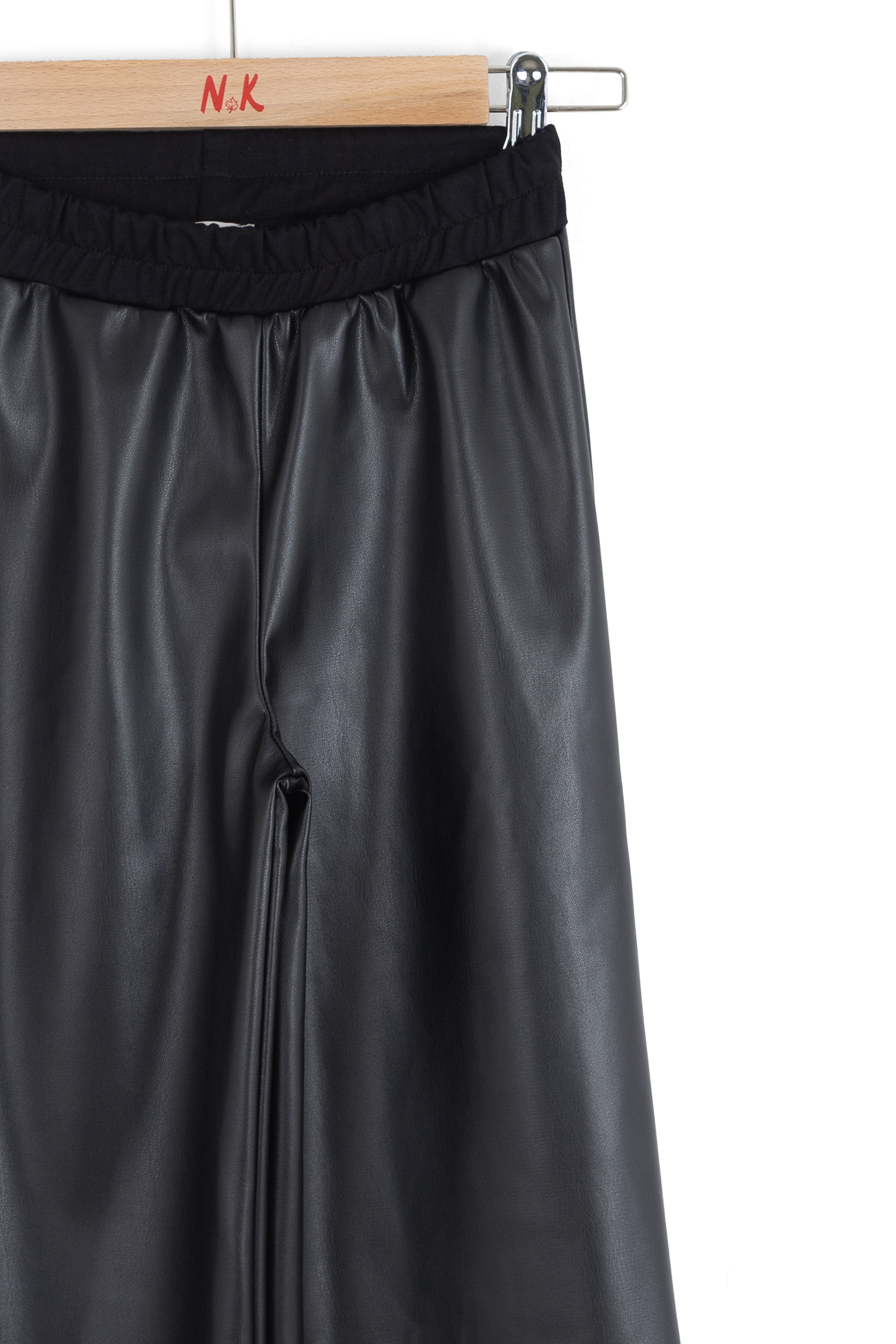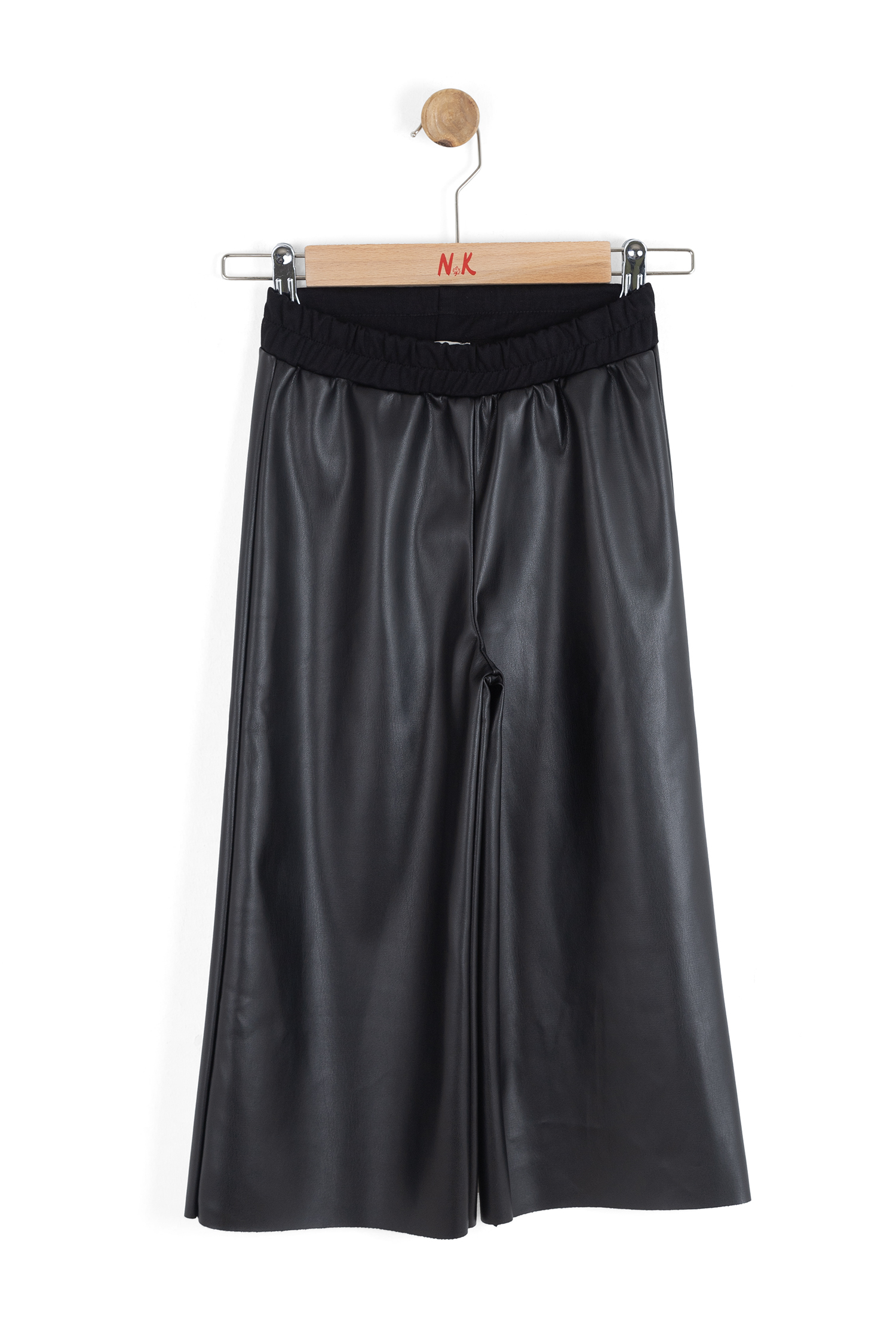 Bu kız çocuk pantolonu, şık ve modern tasarımıyla dikkat çekiyor. Siyah renkli ve deri görünümlü kumaşı sayesinde hem günlük kullanıma hem de özel anlara uygundur. Geniş paçalı ve midi boy uzunluğuyla rahat hareket imkanı sağlar. Elastik bel bandı sayesinde kolayca giyilip çıkarılabilir ve çocukların konforunu artırır.