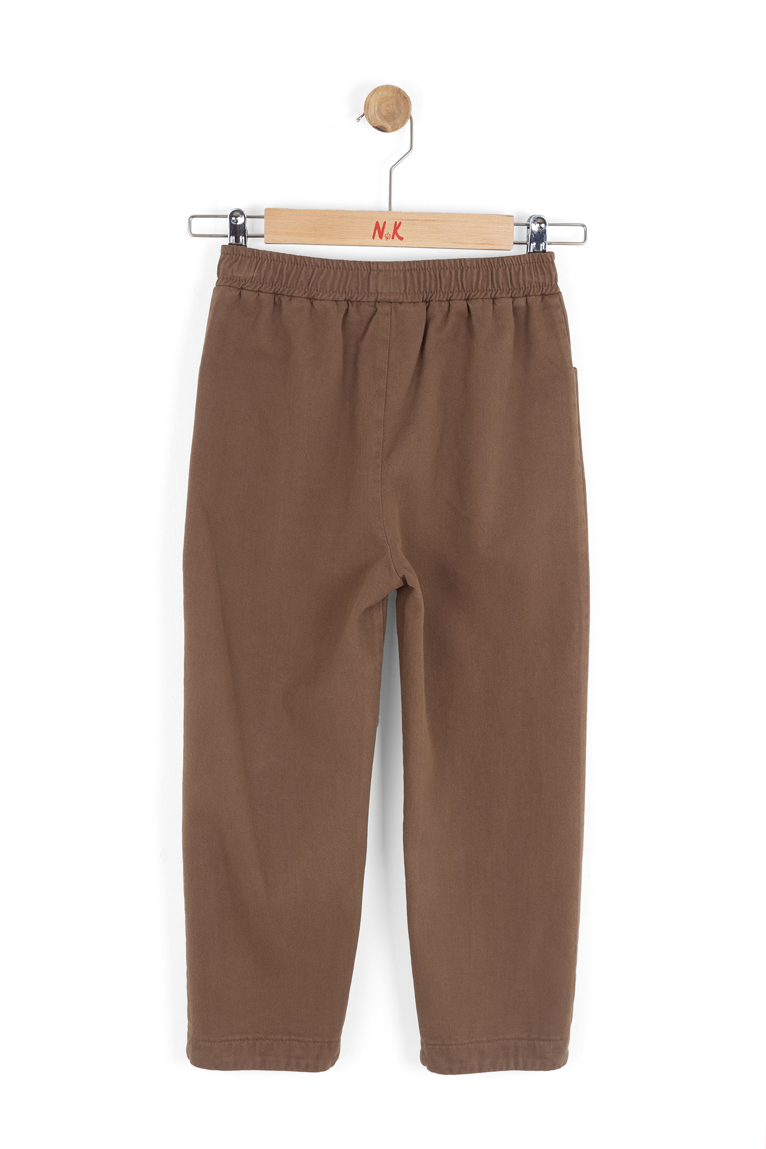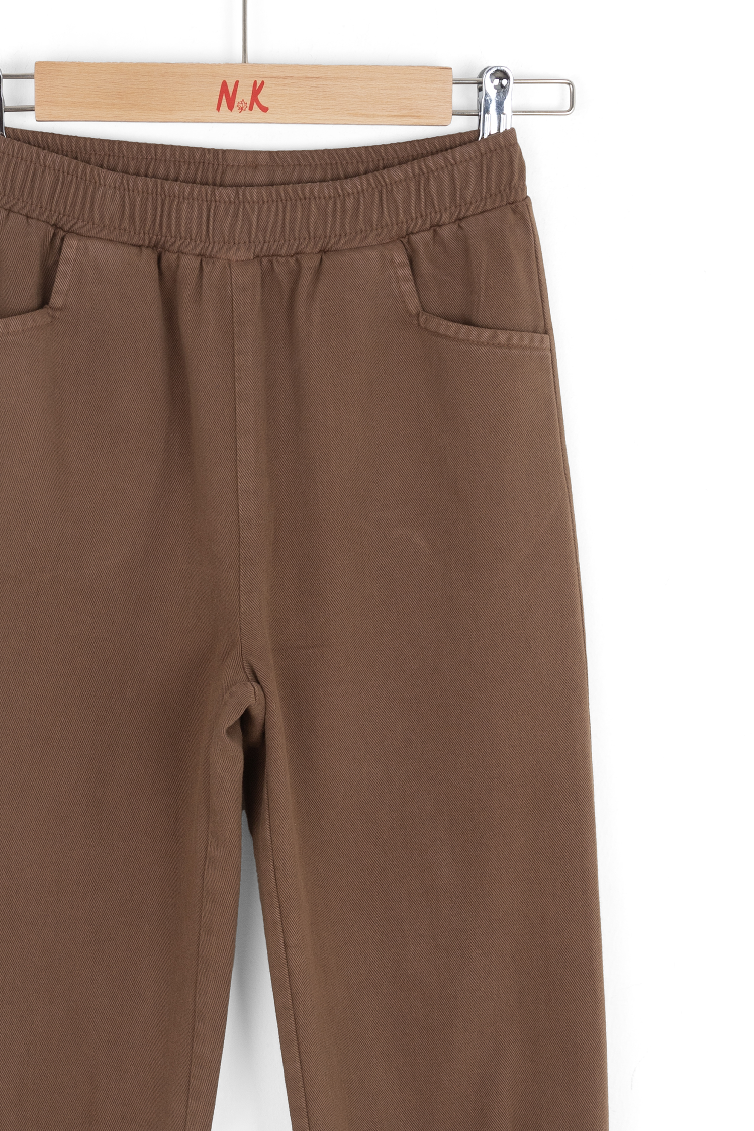 Bu kız çocuk pantolonu, günlük kullanıma uygun rahat ve şık bir tasarıma sahiptir. Kahverengi renkte olup, elastik bel bandı sayesinde kolay giyilip çıkarılabilir. Ön tarafında iki adet cep bulunmakta, bu da küçük eşyaların taşınmasını sağlar. Pantolonun paçaları hafifçe daralan kesime sahiptir ve düz bir yapıya sahiptir. Fermuar veya düğme bulunmayan, sade ve kullanışlı bir modeldir.