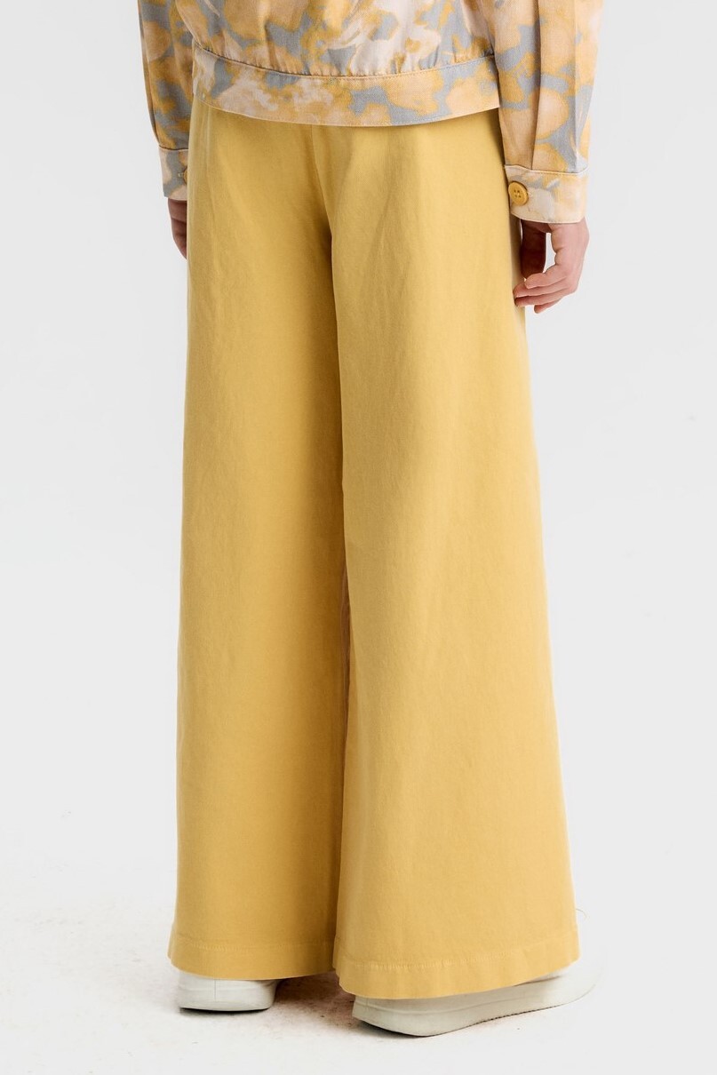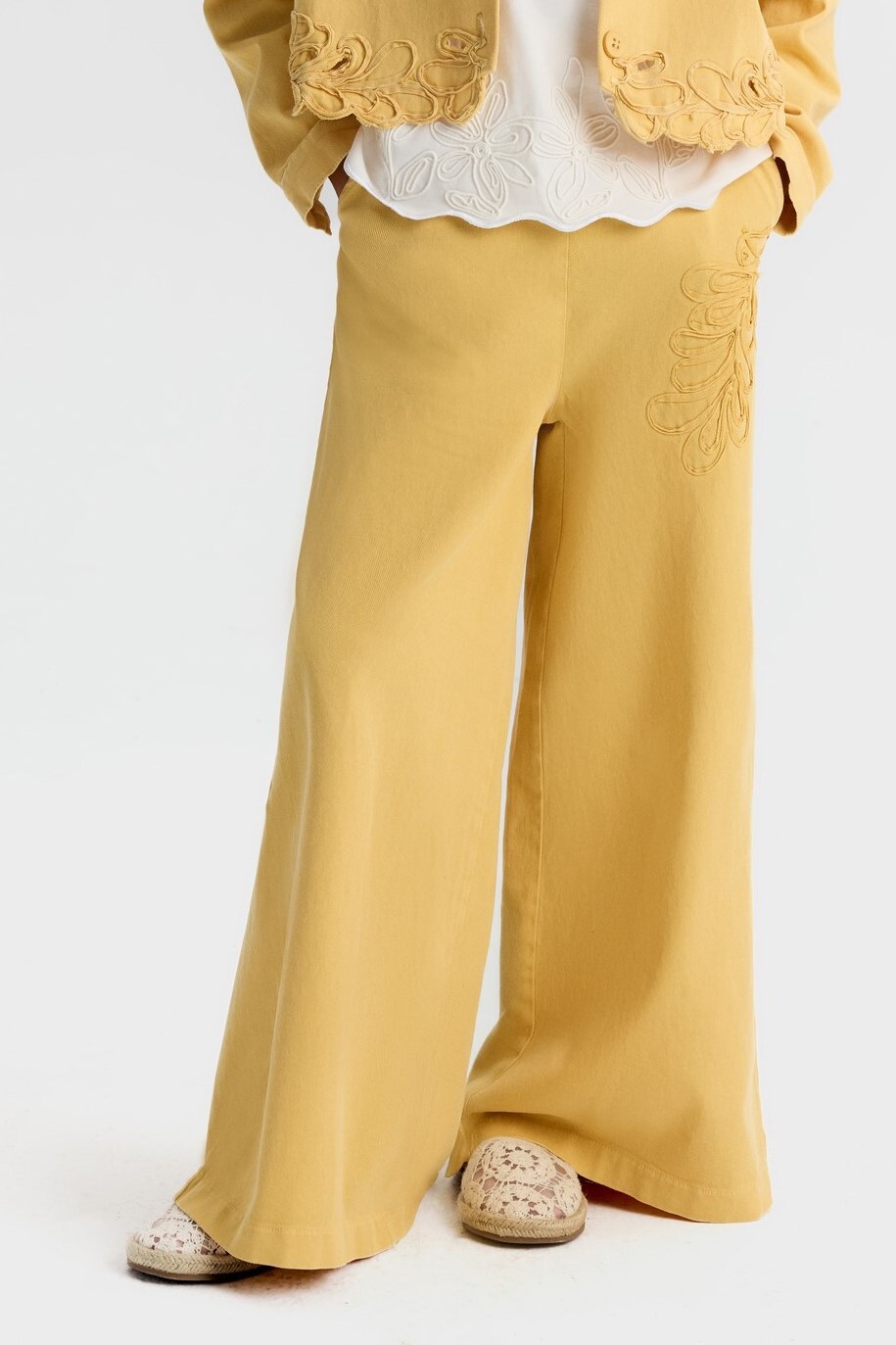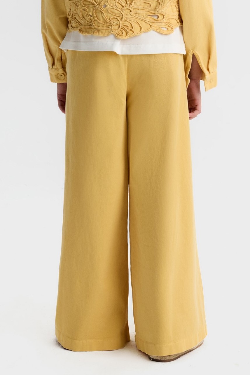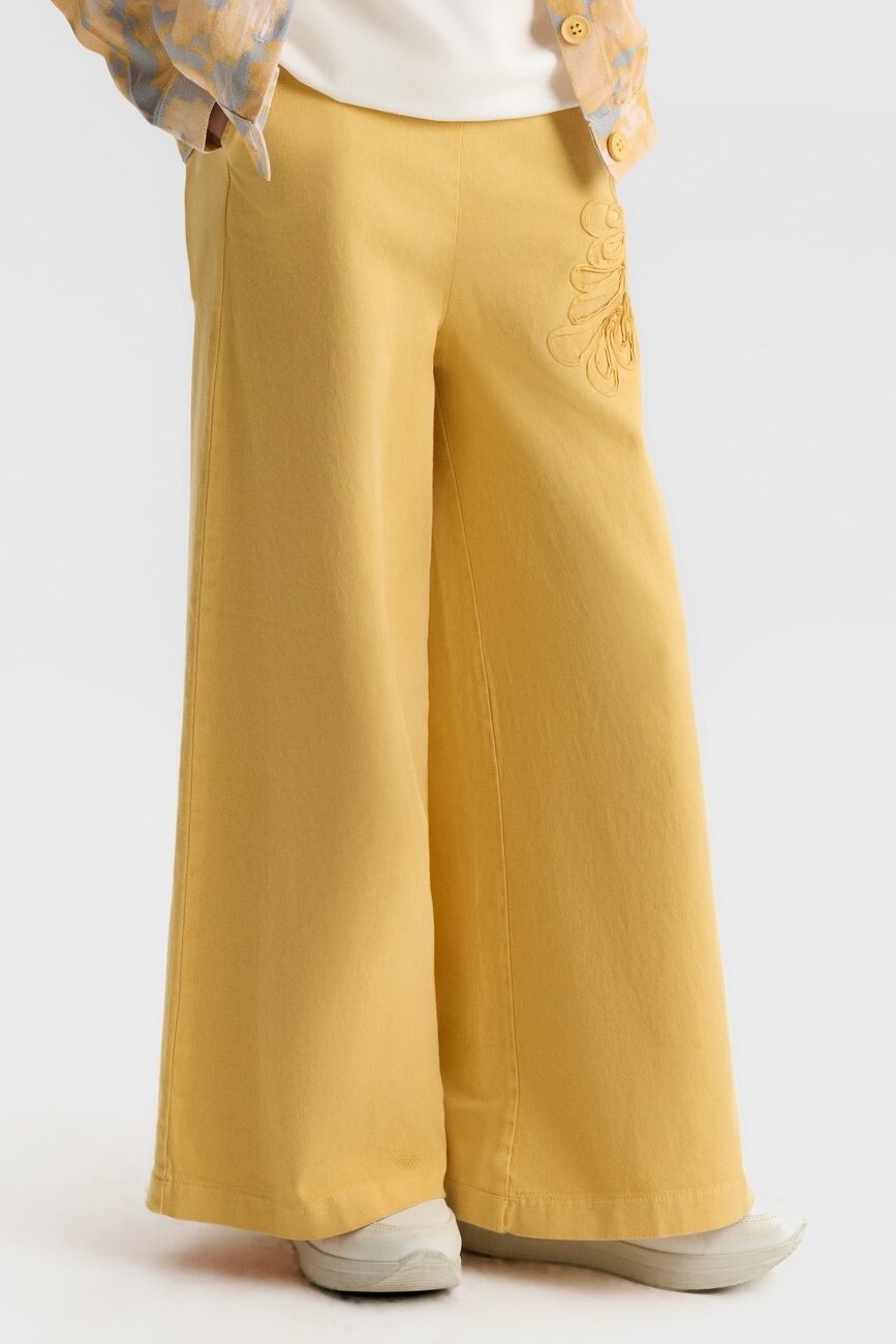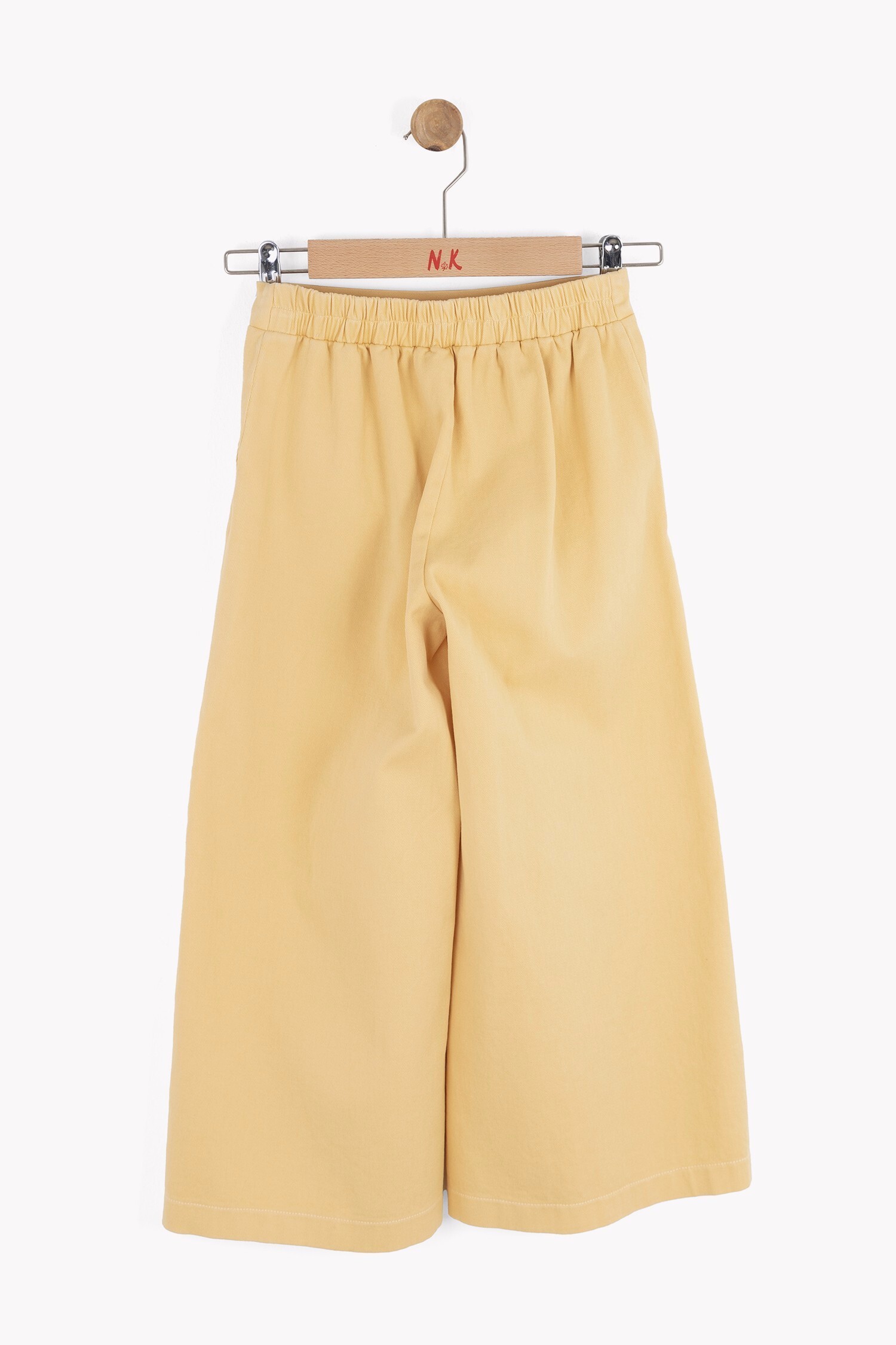 Bu kız çocuk pantolon modeli, bahar ayları için ideal olan rahat ve şık bir seçenektir. Sarı rengindeki pantolon, geniş paça kesimiyle özgür ve hareketli bir kullanım sunar. Bel kısmı lastikli olup, kolay giyilip çıkarılabilme imkanı sağlar. Pantolonun sağ üst kısmında zarif bir nakış detayı bulunmakta, sade tasarıma hoş bir dokunuş katmaktadır. Cepli olmayan bu model, günlük kullanıma ve özel günlere uygun, modern ve rahat bir tarza sahiptir.