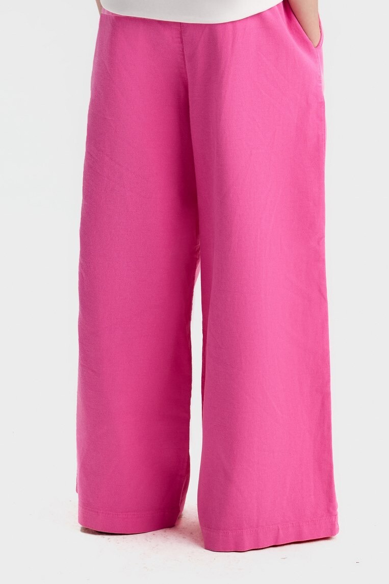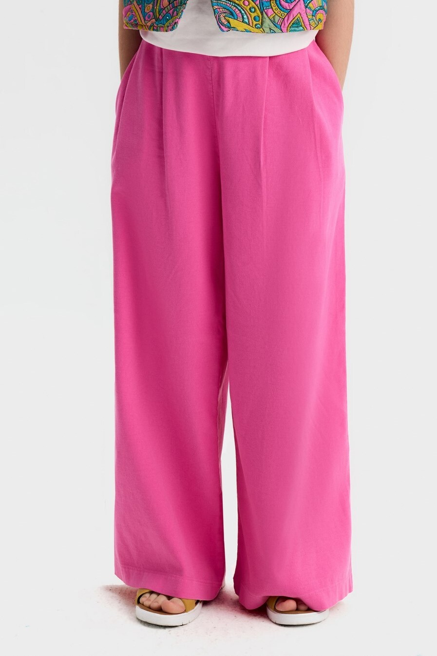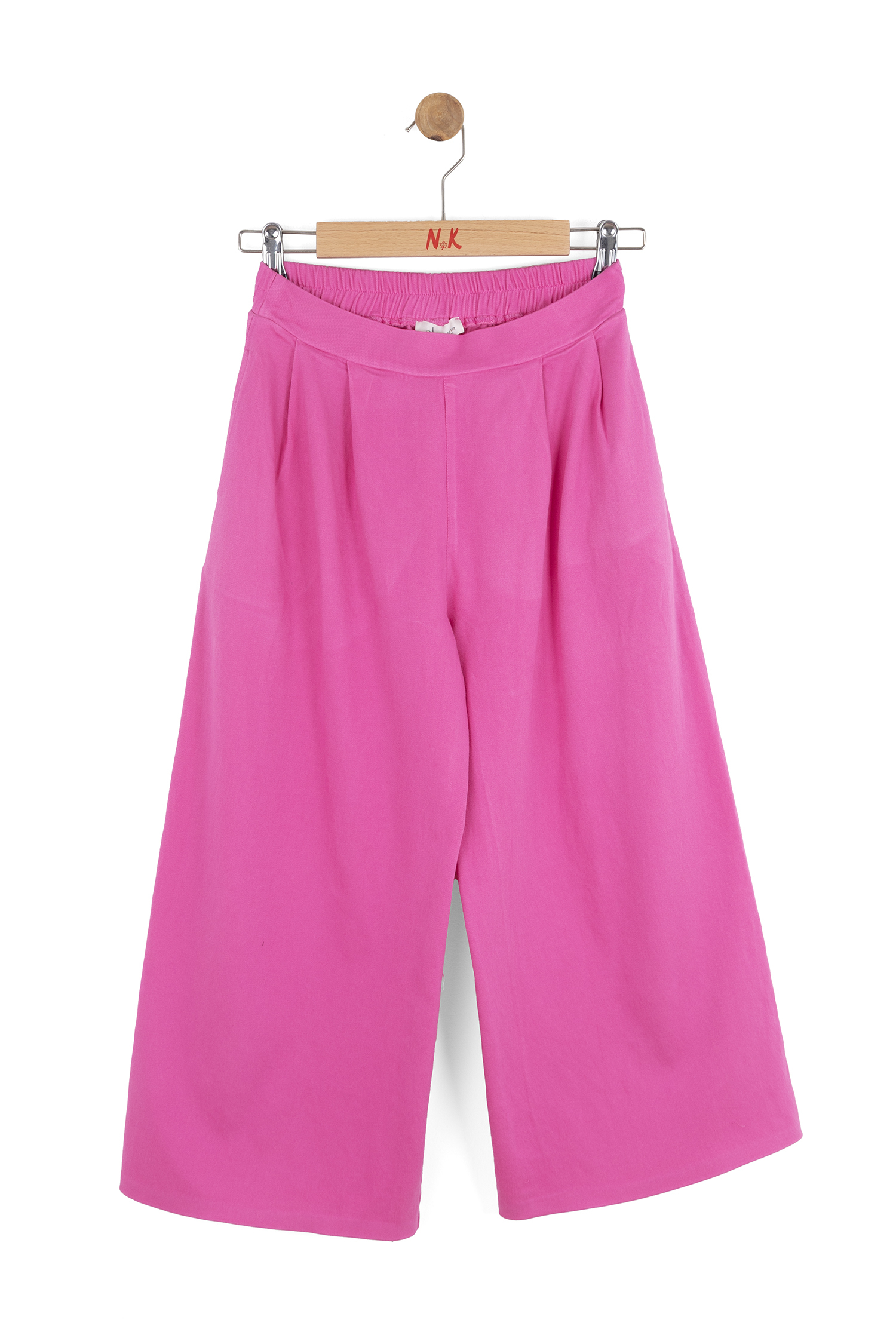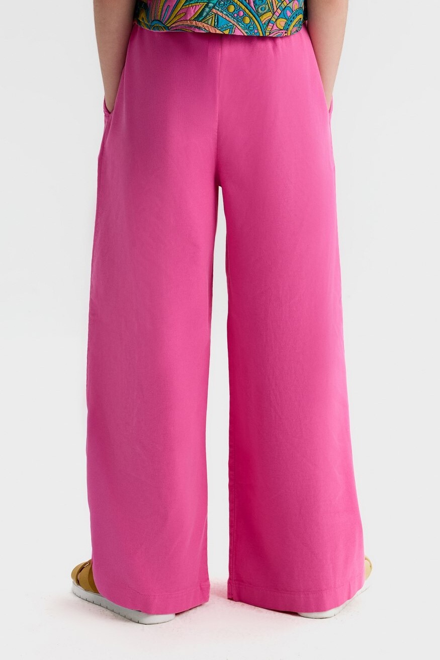 Bu kız çocuk pantolonu, bahar mevsimine uygun canlı fuşya renginde tasarlanmıştır. Rahat ve geniş kesimi sayesinde gün boyu konfor sağlar. Bel kısmı lastikli olup, kolay giyilip çıkarılabilir. Yanlarda cepler bulunur, böylece küçük eşyalar kolayca taşınabilir. Düz ve sade yapısı, farklı üstlerle kombinlenmeye uygundur. Modern ve şık görünümüyle çocukların günlük aktiviteleri için idealdir.