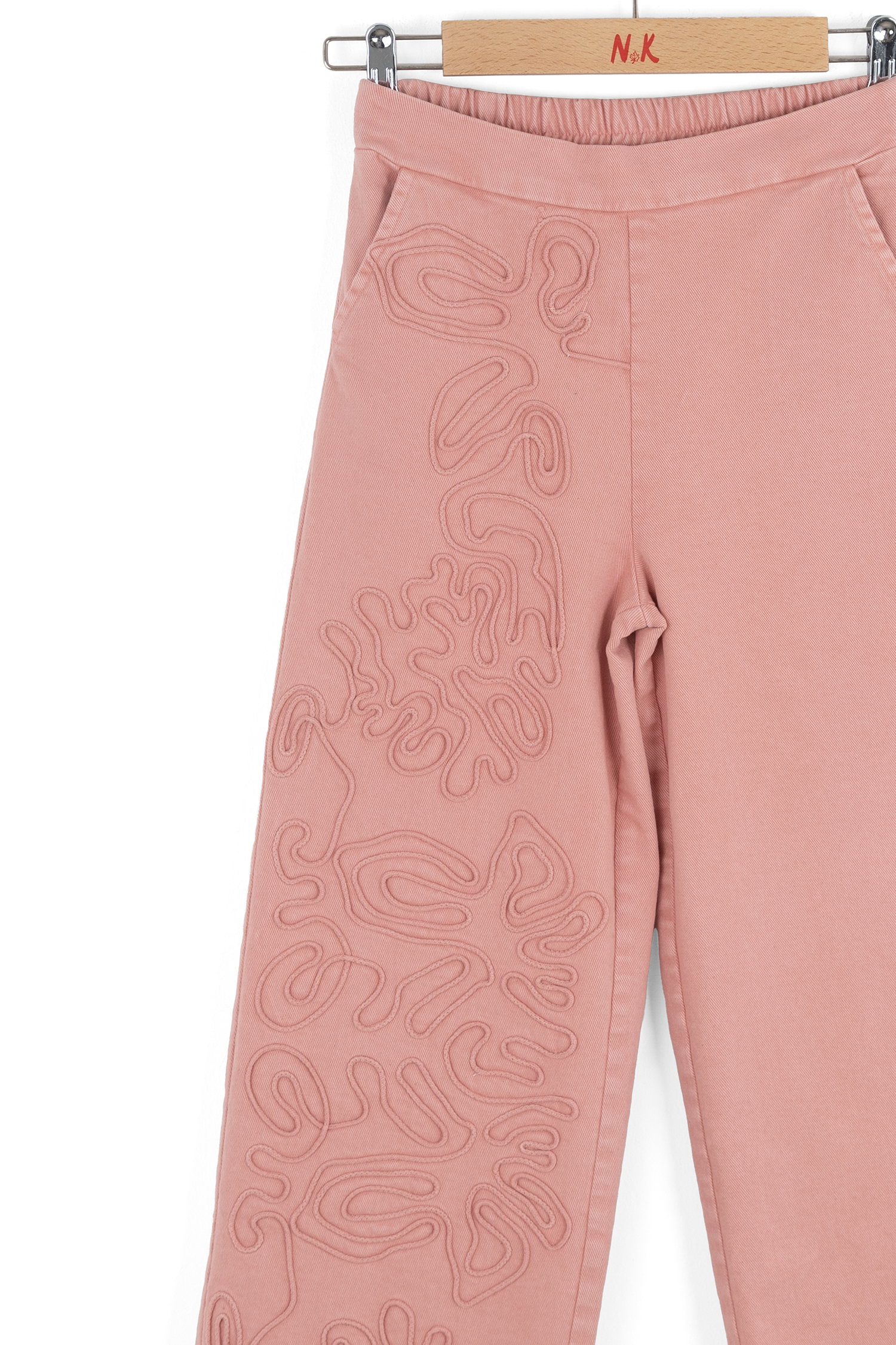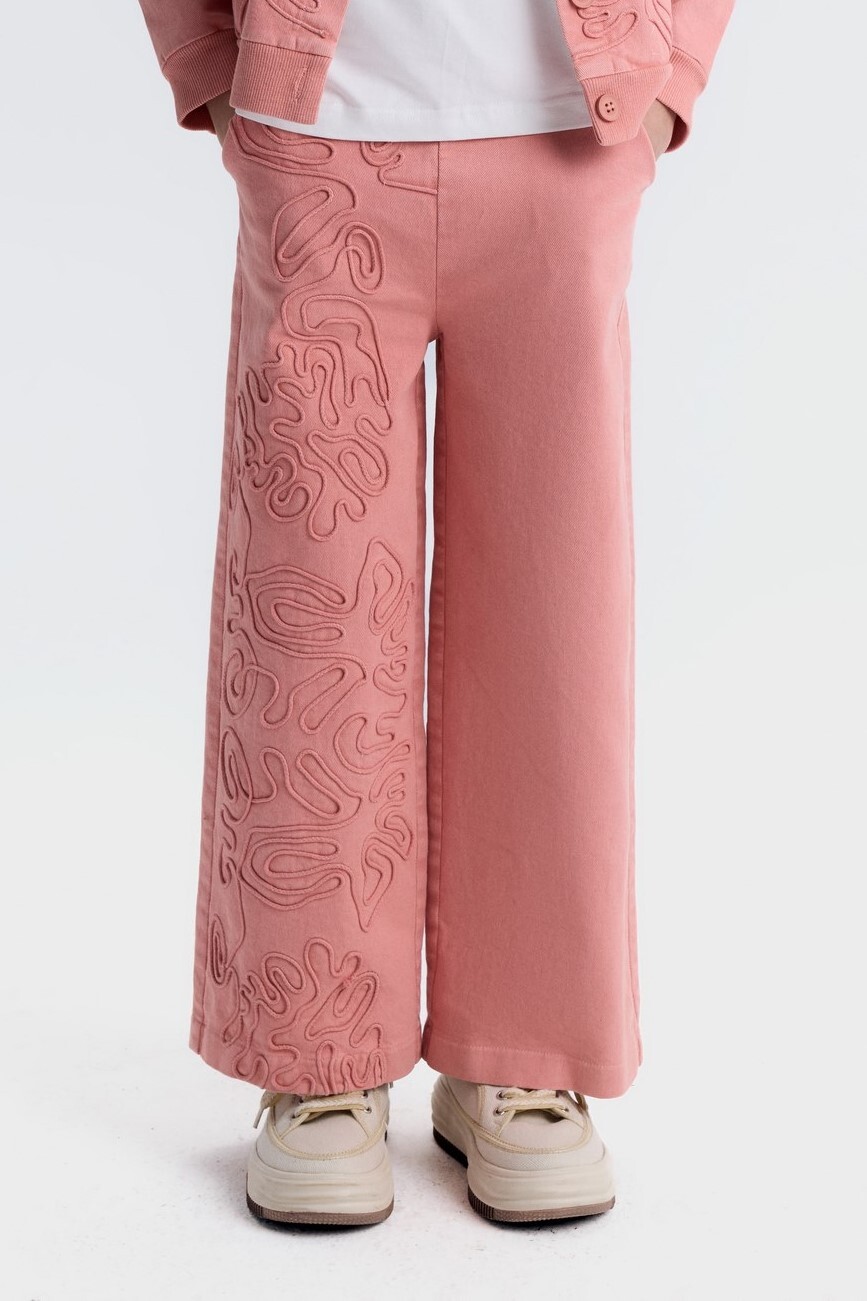 Bu kız çocuk pantolonu, bahar sezonu için özel olarak tasarlanmış şık ve rahat bir üründür. Pantolon, bol kesim olup midi boydadır ve özellikle sol bacakta kabartma desenlerle süslenmiştir. Bel kısmında herhangi bir fermuar, düğme veya kordon bulunmamakta, sade ve temiz bir görünüm sunmaktadır. Renk olarak pembe tonlarında, gül kurusuna yakın pastel bir renktir. Günlük ve casual kullanıma uygun olan bu pantolon, çocukların rahat hareket etmesini sağlar.