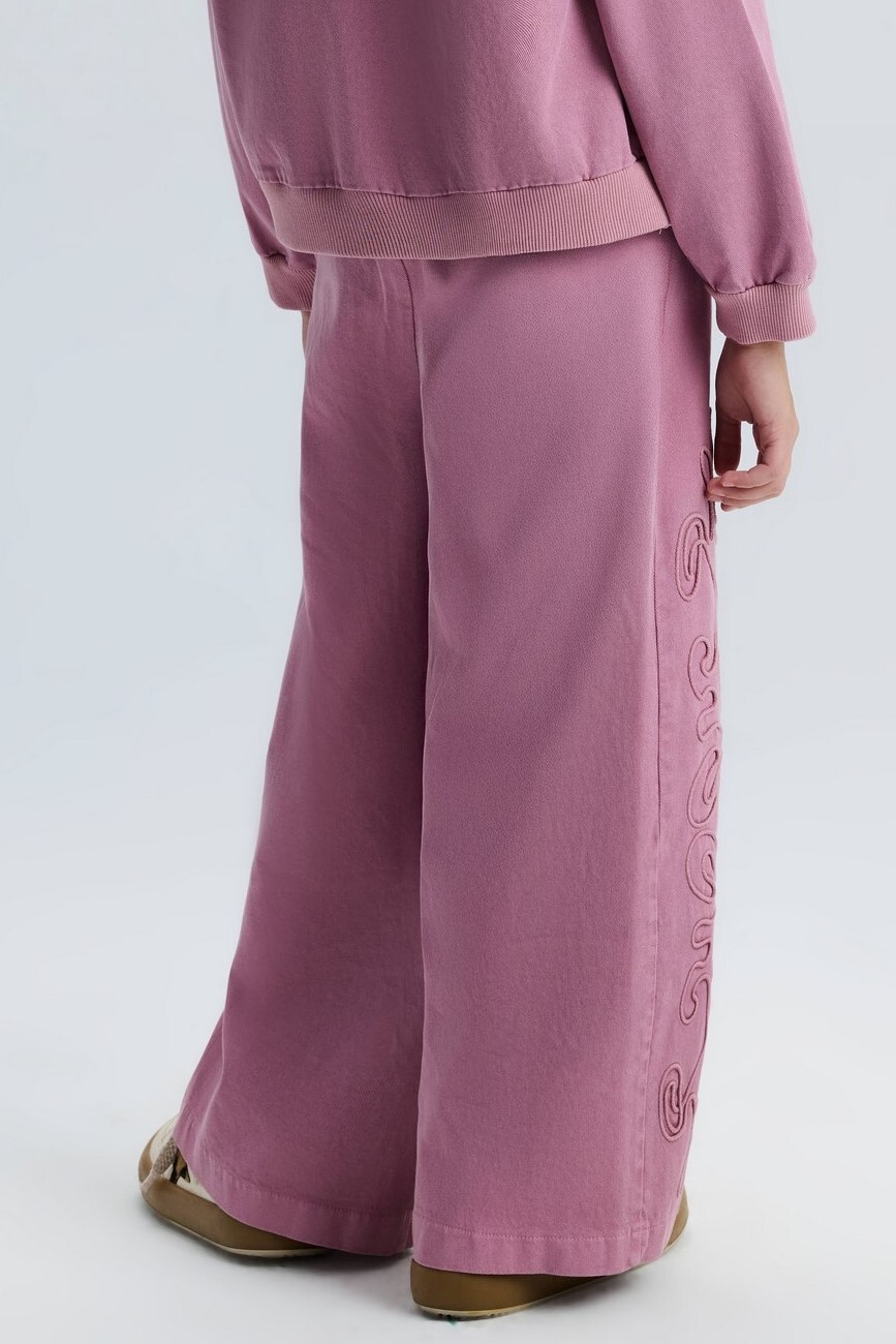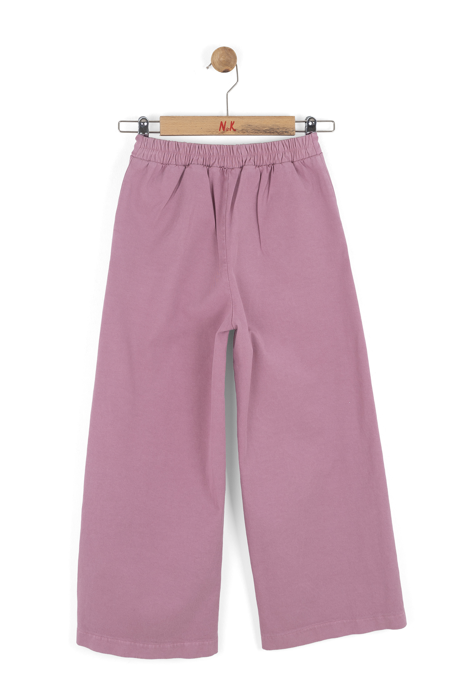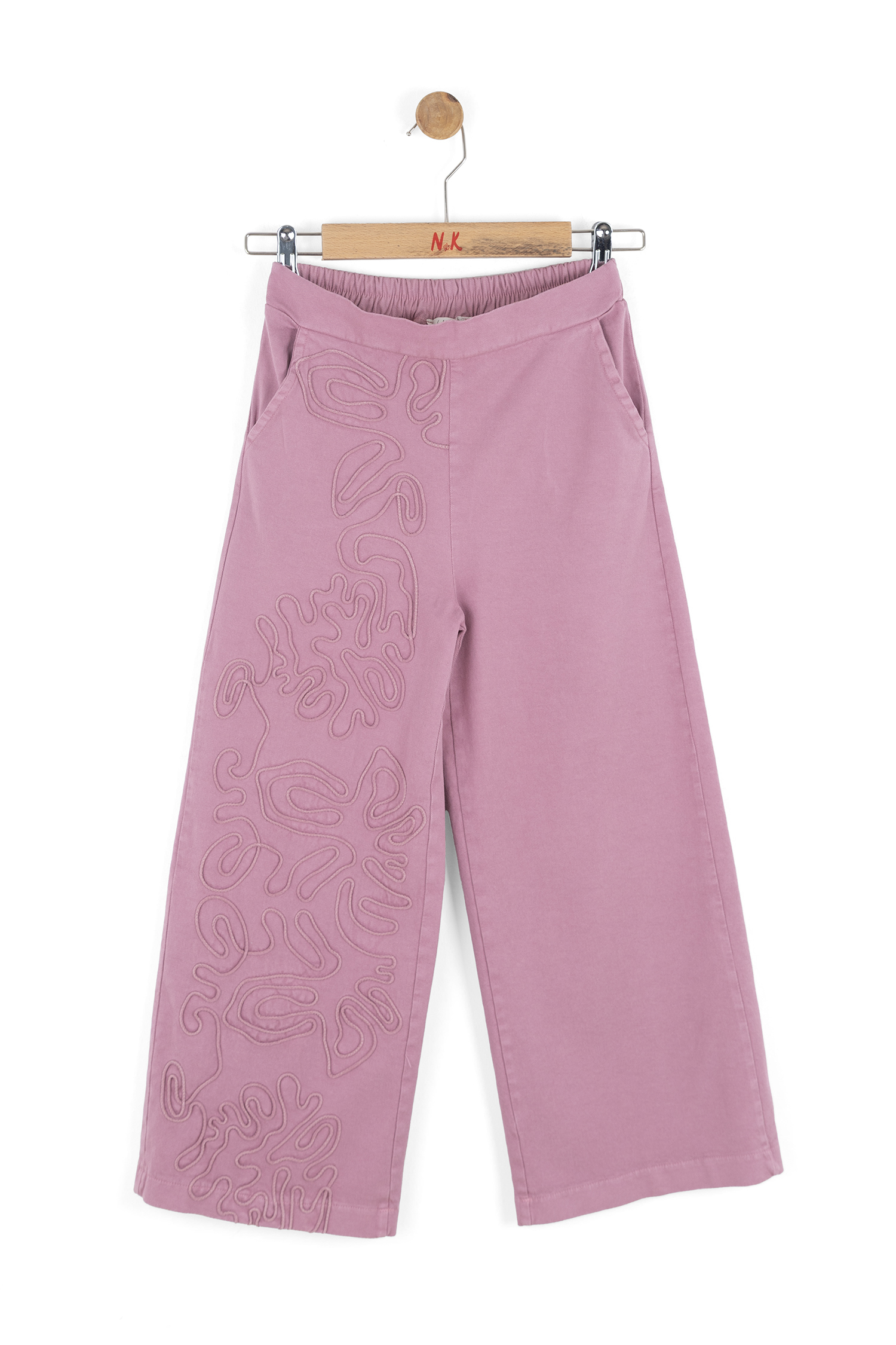 Bu kız çocuk pantolonu, bahar sezonu için özel olarak tasarlanmış şık ve rahat bir üründür. Pantolon, bol kesim olup midi boydadır ve özellikle sol bacakta kabartma desenlerle süslenmiştir. Bel kısmında herhangi bir fermuar, düğme veya kordon bulunmamakta, sade ve temiz bir görünüm sunmaktadır. Renk olarak pembe tonlarında, gül kurusuna yakın pastel bir renktir. Günlük ve casual kullanıma uygun olan bu pantolon, çocukların rahat hareket etmesini sağlar.