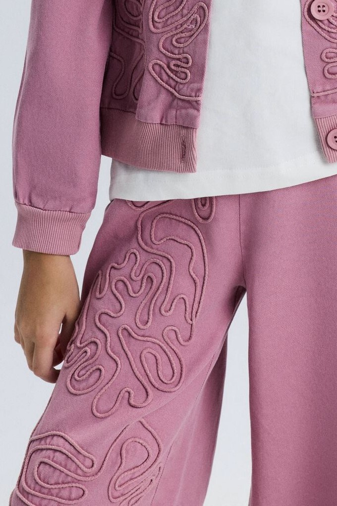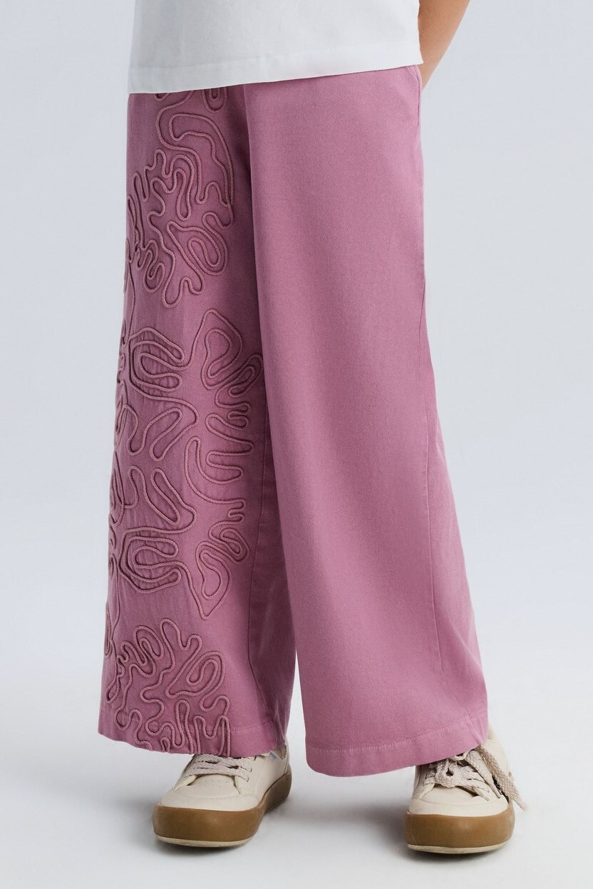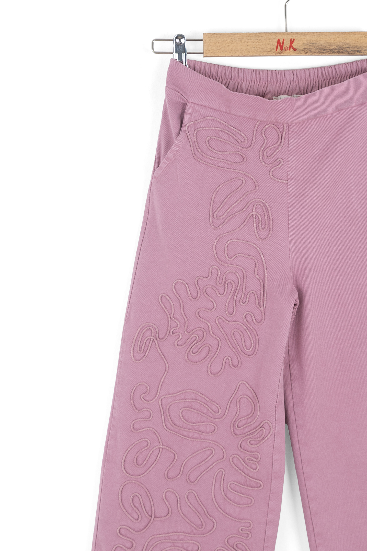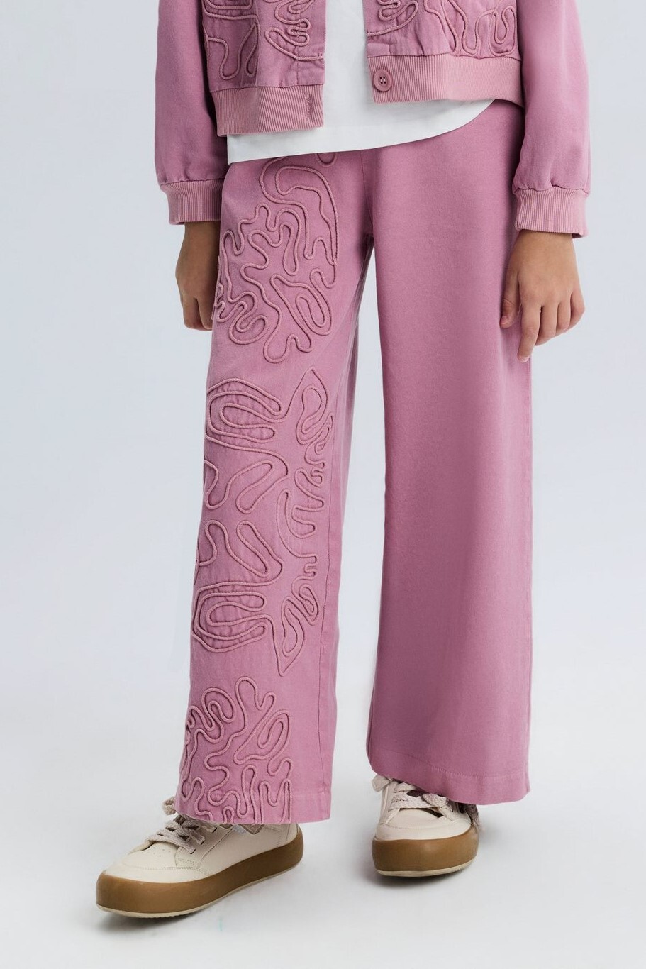 Bu kız çocuk pantolonu, bahar sezonu için özel olarak tasarlanmış şık ve rahat bir üründür. Pantolon, bol kesim olup midi boydadır ve özellikle sol bacakta kabartma desenlerle süslenmiştir. Bel kısmında herhangi bir fermuar, düğme veya kordon bulunmamakta, sade ve temiz bir görünüm sunmaktadır. Renk olarak pembe tonlarında, gül kurusuna yakın pastel bir renktir. Günlük ve casual kullanıma uygun olan bu pantolon, çocukların rahat hareket etmesini sağlar.