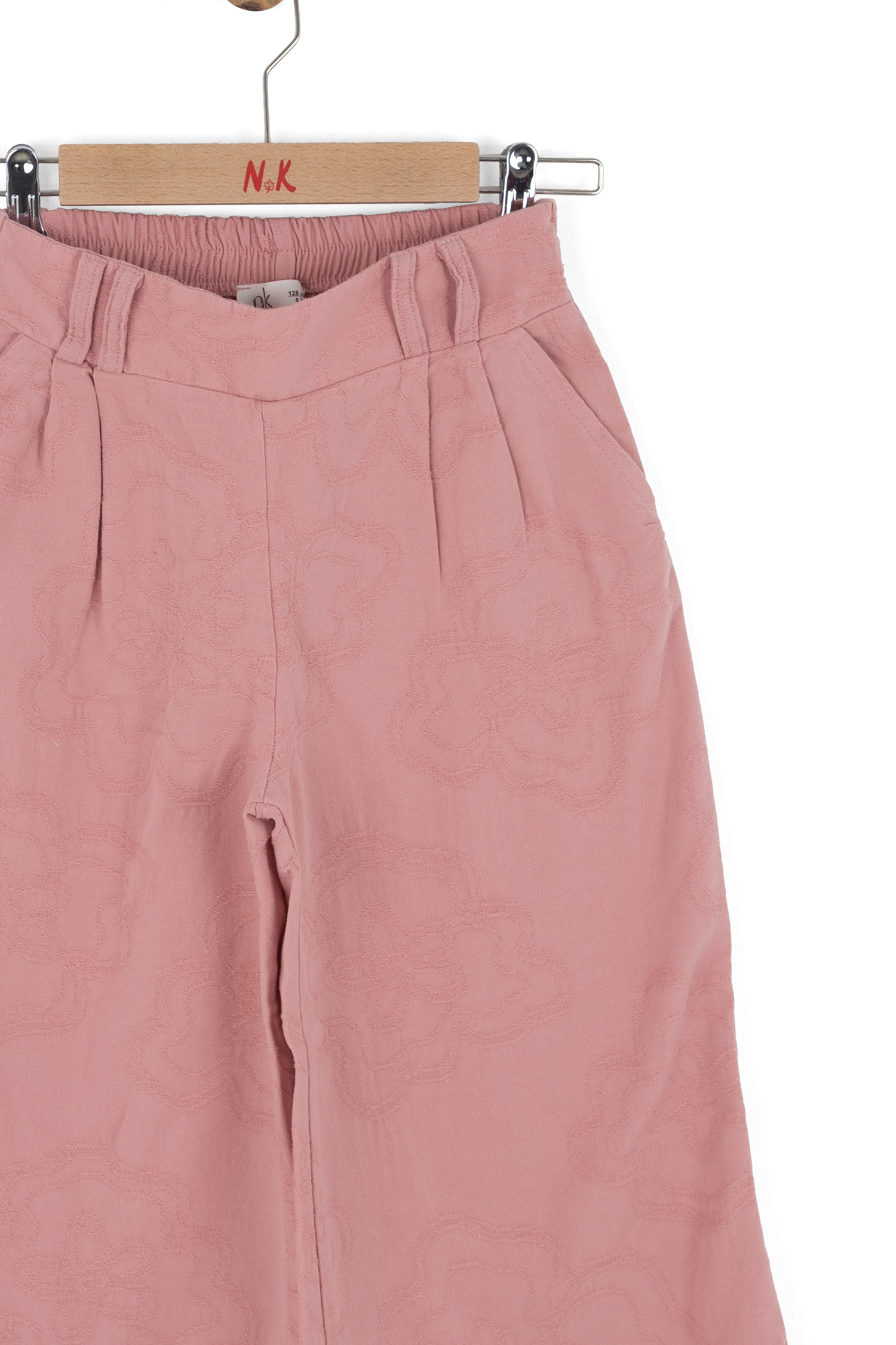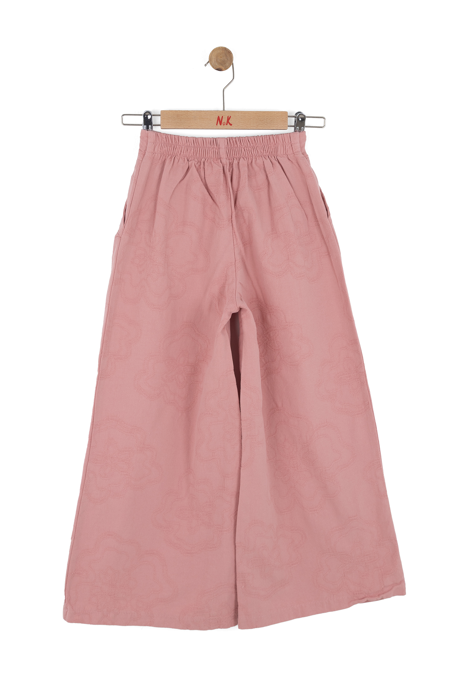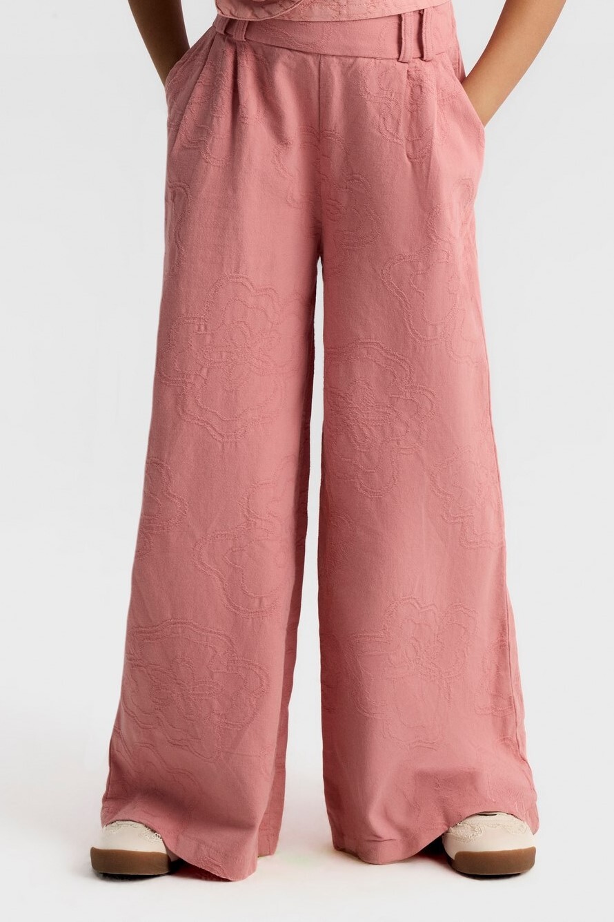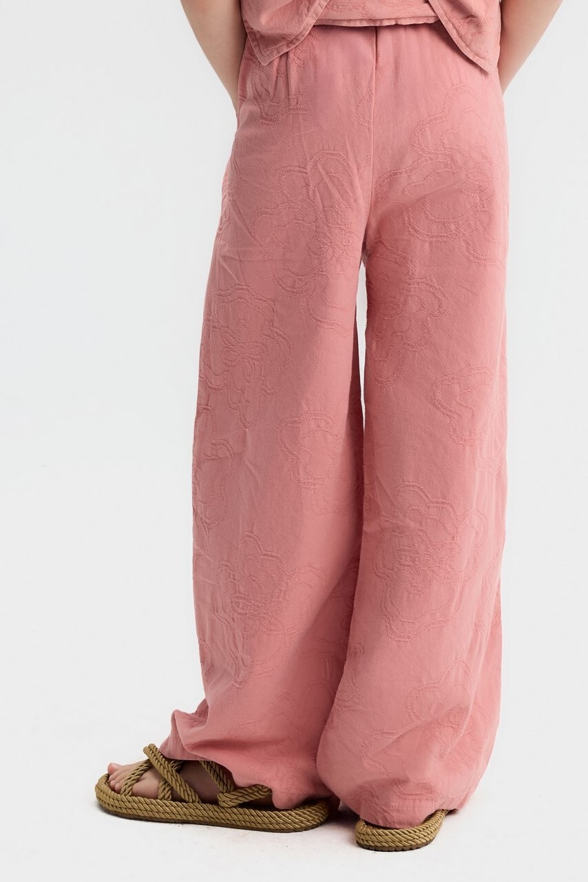 Bu kız çocuk pantolonu, rahat ve şık bir görünüm sunar. Gül kurusu rengindeki pantolon, geniş paça kesimi ve yüksek bel tasarımıyla modern ve trend bir tarz yaratır. Kumaşın üzerinde hafif kabartmalı çiçek desenleri bulunur, bu da ürüne zarif bir dokunuş katar. Pantolonun yan cepleri bulunmakta olup, arkada elastik bel detayı sayesinde ekstra konfor sağlar. Bahar mevsimi için ideal, hafif ve nefes alabilen bir kumaştan üretilmiştir.