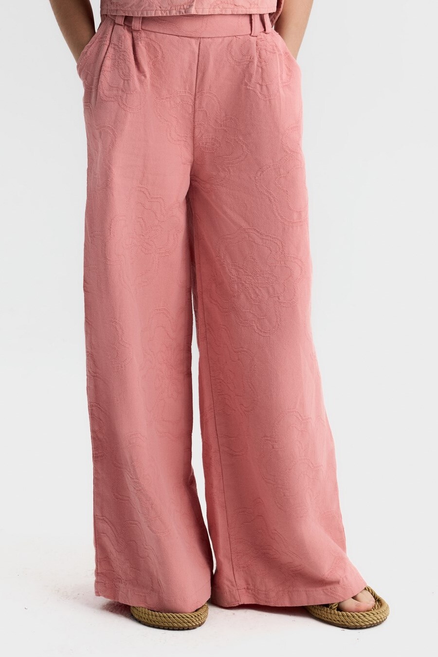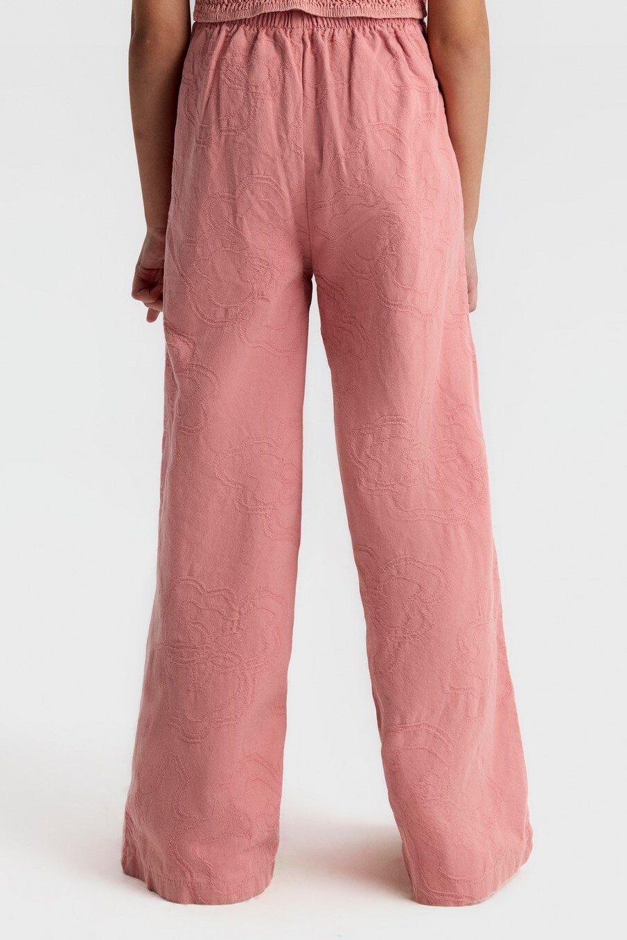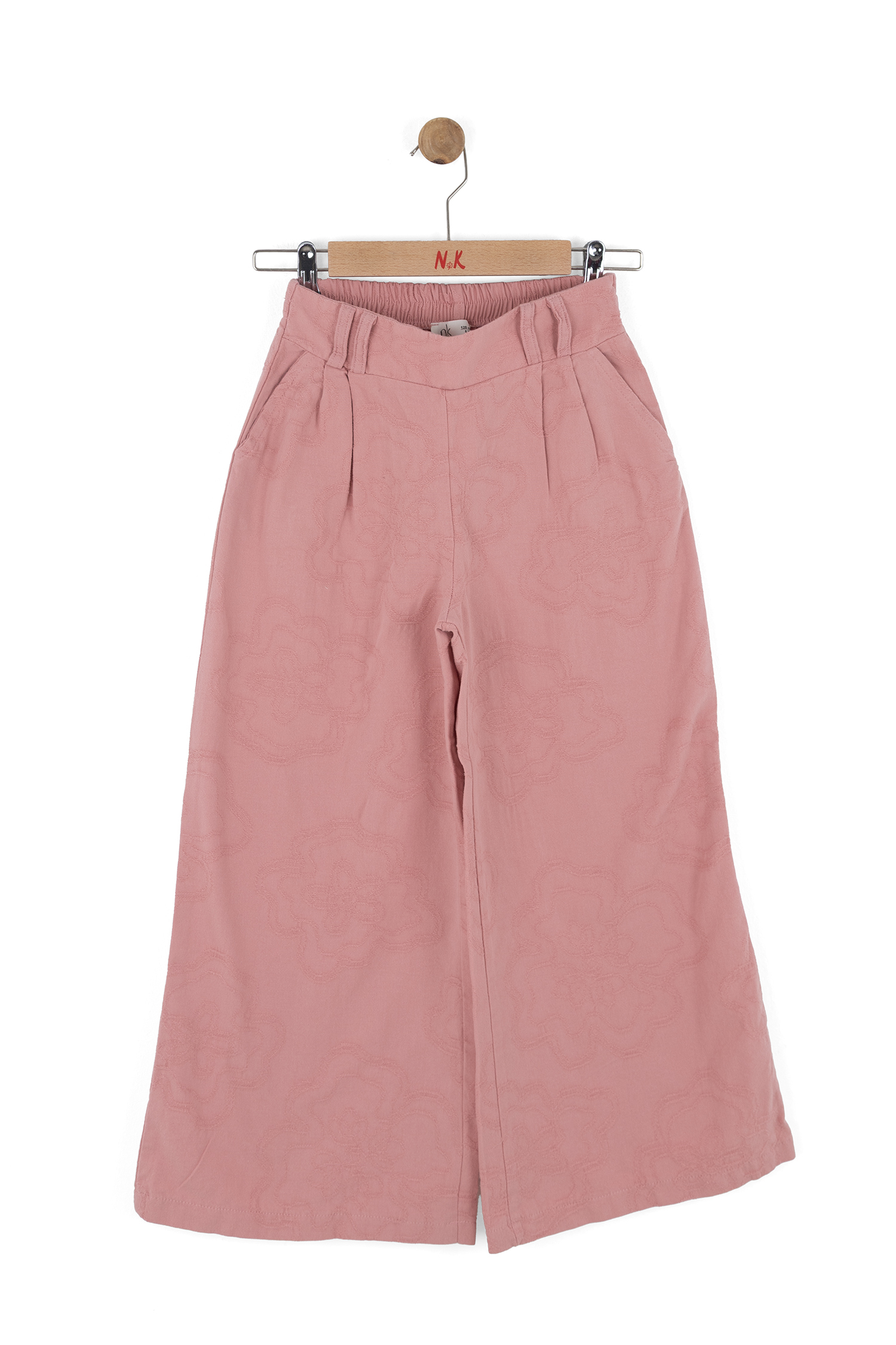 Bu kız çocuk pantolonu, rahat ve şık bir görünüm sunar. Gül kurusu rengindeki pantolon, geniş paça kesimi ve yüksek bel tasarımıyla modern ve trend bir tarz yaratır. Kumaşın üzerinde hafif kabartmalı çiçek desenleri bulunur, bu da ürüne zarif bir dokunuş katar. Pantolonun yan cepleri bulunmakta olup, arkada elastik bel detayı sayesinde ekstra konfor sağlar. Bahar mevsimi için ideal, hafif ve nefes alabilen bir kumaştan üretilmiştir.