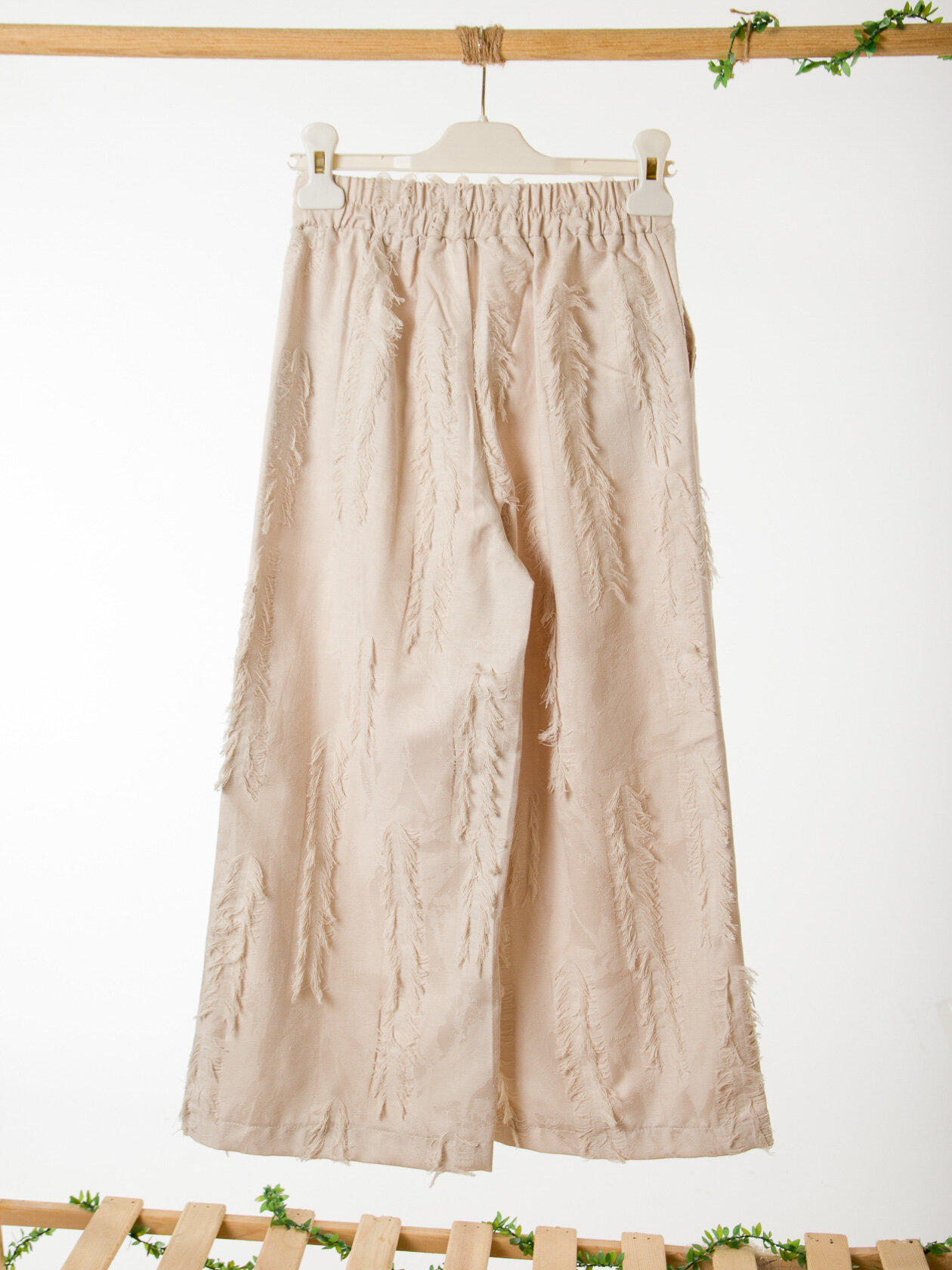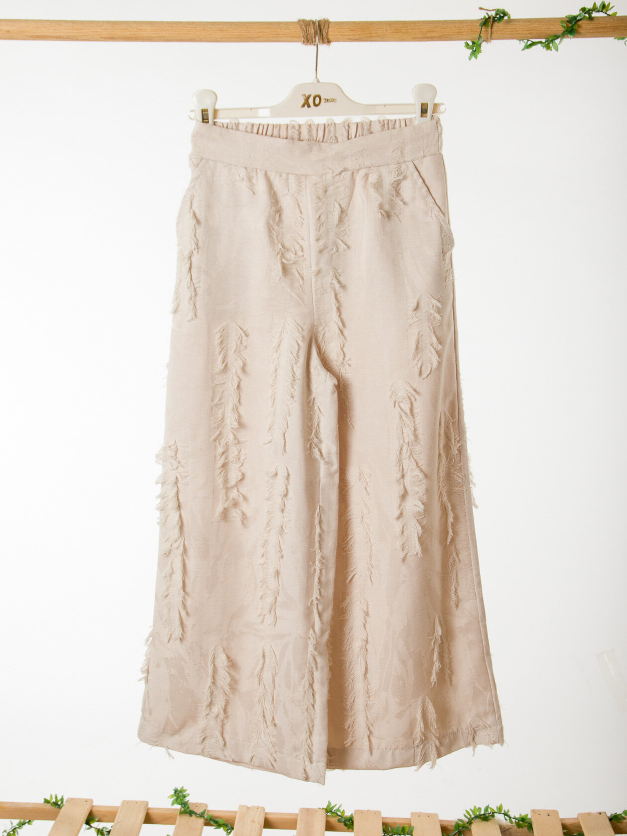 تتميز هذه البنطلونات للفتيات بقصة الأرجل الواسعة وتصميم مريح، مما يجعلها مثالية لموسم الربيع. اللون الكريمي يمنح مظهرًا بسيطًا وأنيقًا، بينما تضيف التفاصيل المزخرفة المكسوة بالشرابات لمسة فريدة وعصرية. يحتوي الخصر على حزام مطاطي لسهولة الارتداء وحرية الحركة. الجيوب الجانبية تضيف وظيفة عملية.