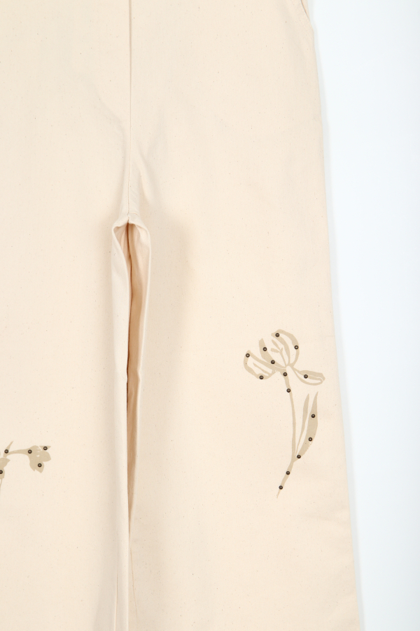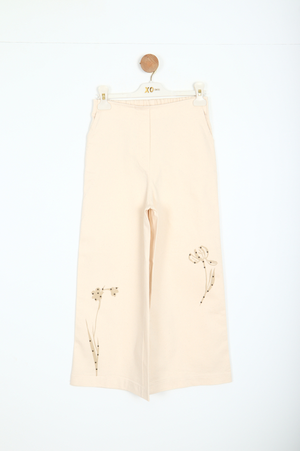 Bu krem renkli kız çocuk pantolonu, rahat ve şık bir günlük kullanım için idealdir. Geniş paça kesimi sayesinde hareket özgürlüğü sunar ve elastik belli yapısıyla rahat bir oturuş sağlar. Ön kısmında bulunan ince çiçek desenleri pantolona zarif bir dokunuş katarken, yan cepleri pratiklik sunar. Minimalist ve doğal tonlarıyla hem spor hem de casual kombinlere uyum sağlar.
