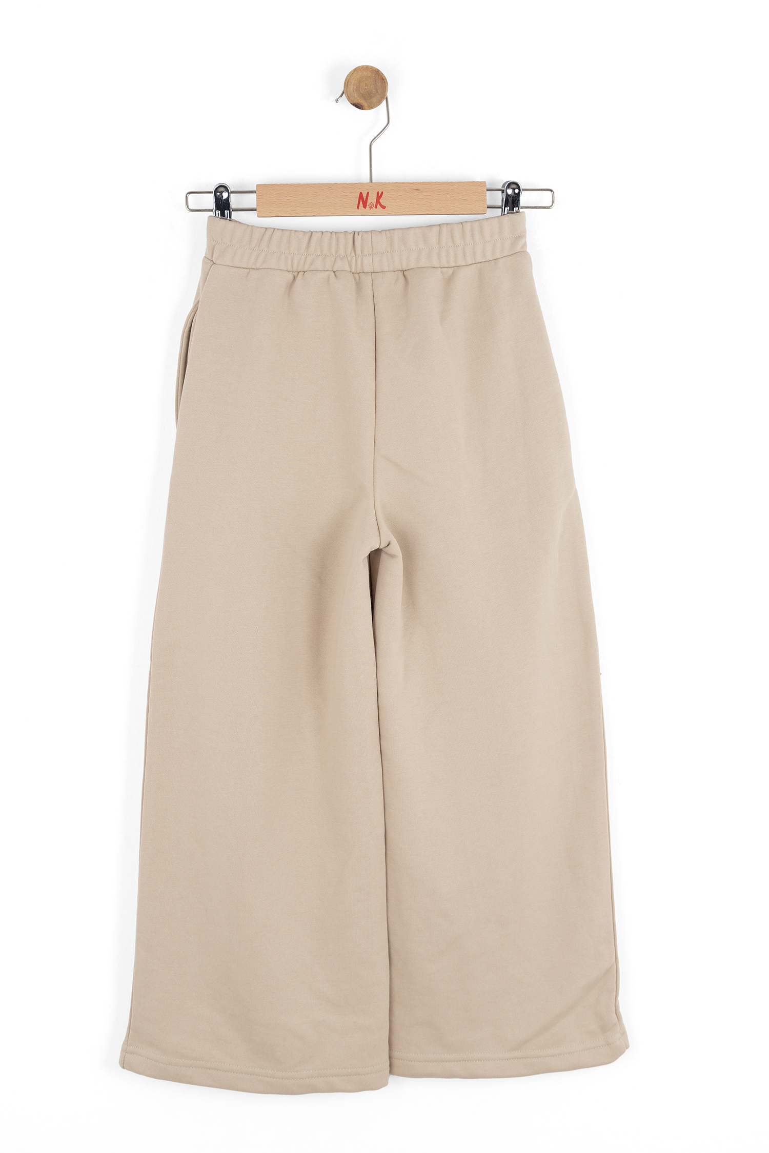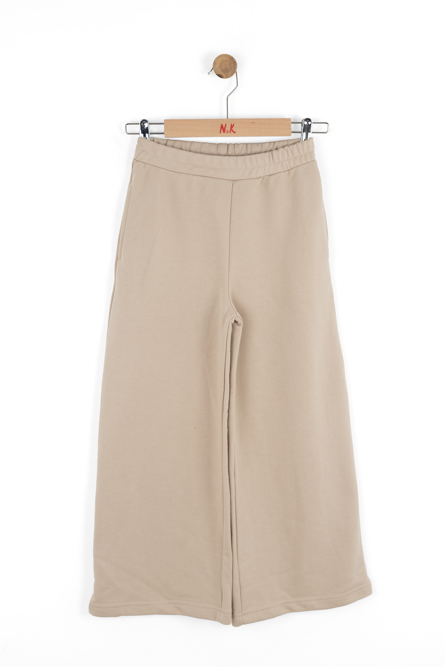 Bu kız çocuk pantolonu, rahat ve şık tasarımıyla günlük kullanım için ideal bir seçimdir. Camel rengindeki kumaşı yumuşak ve esnek yapısıyla hareket özgürlüğü sağlar. Geniş paça kesimi ile trend bir görünüm sunarken, bel kısmındaki lastik detay sayesinde kolay giyilip çıkarılabilir. Cepli yapısı ise pratik kullanım imkanı tanır.