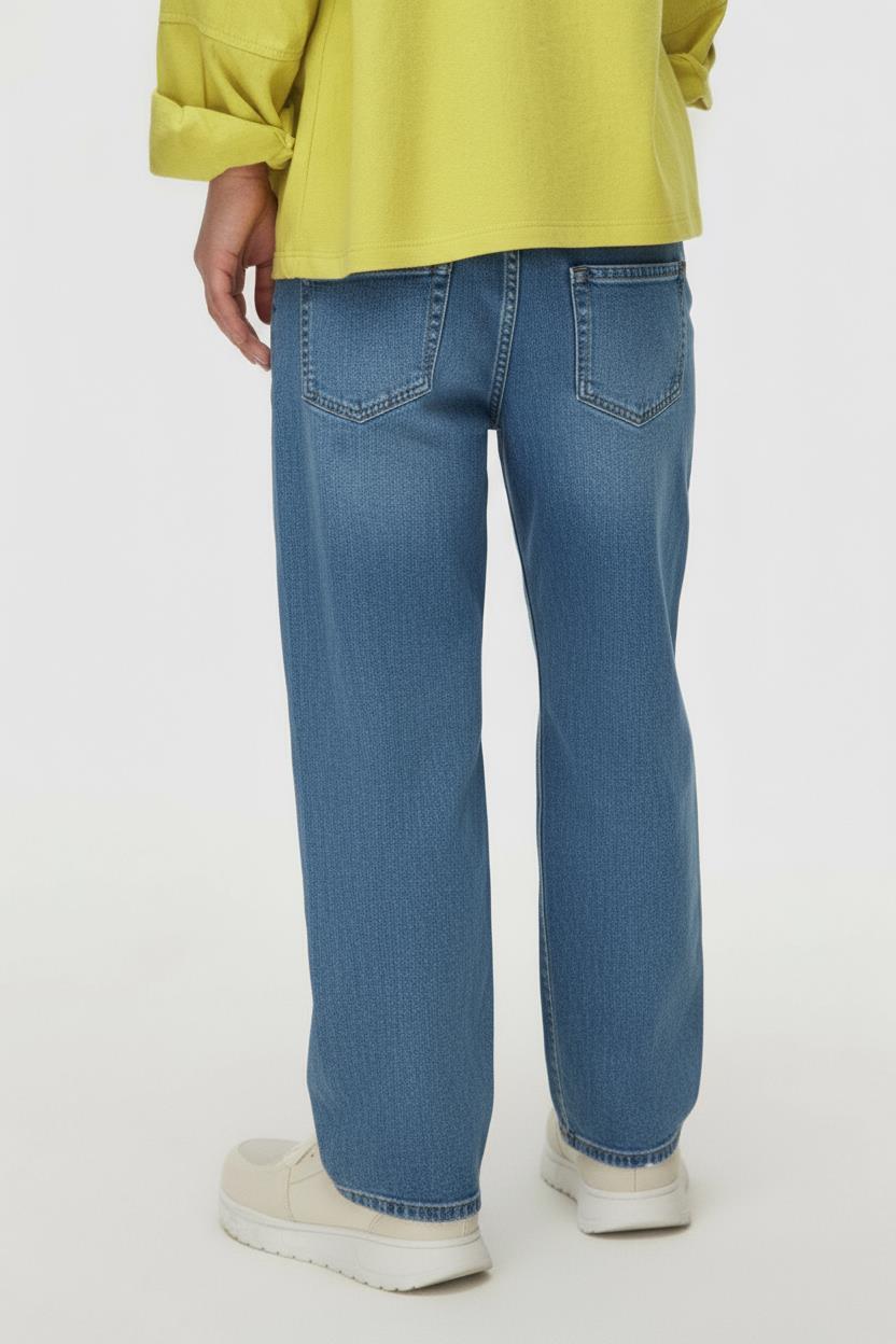 تتميز بنطلون الجينز هذا للبنات بالراحة والأناقة للاستخدام اليومي. يأتي بلون أزرق متوسط، وتصميم مستقيم مع أرجل واسعة قليلاً لسهولة الحركة. تضيف الجيوب الأمامية والخلفية لمسة عملية، في حين تمنح التفاصيل المهترئة الدقيقة البنطلون مظهراً رياضياً. مصنوع من قماش متين وناعم لضمان راحة الأطفال أثناء الحركة.