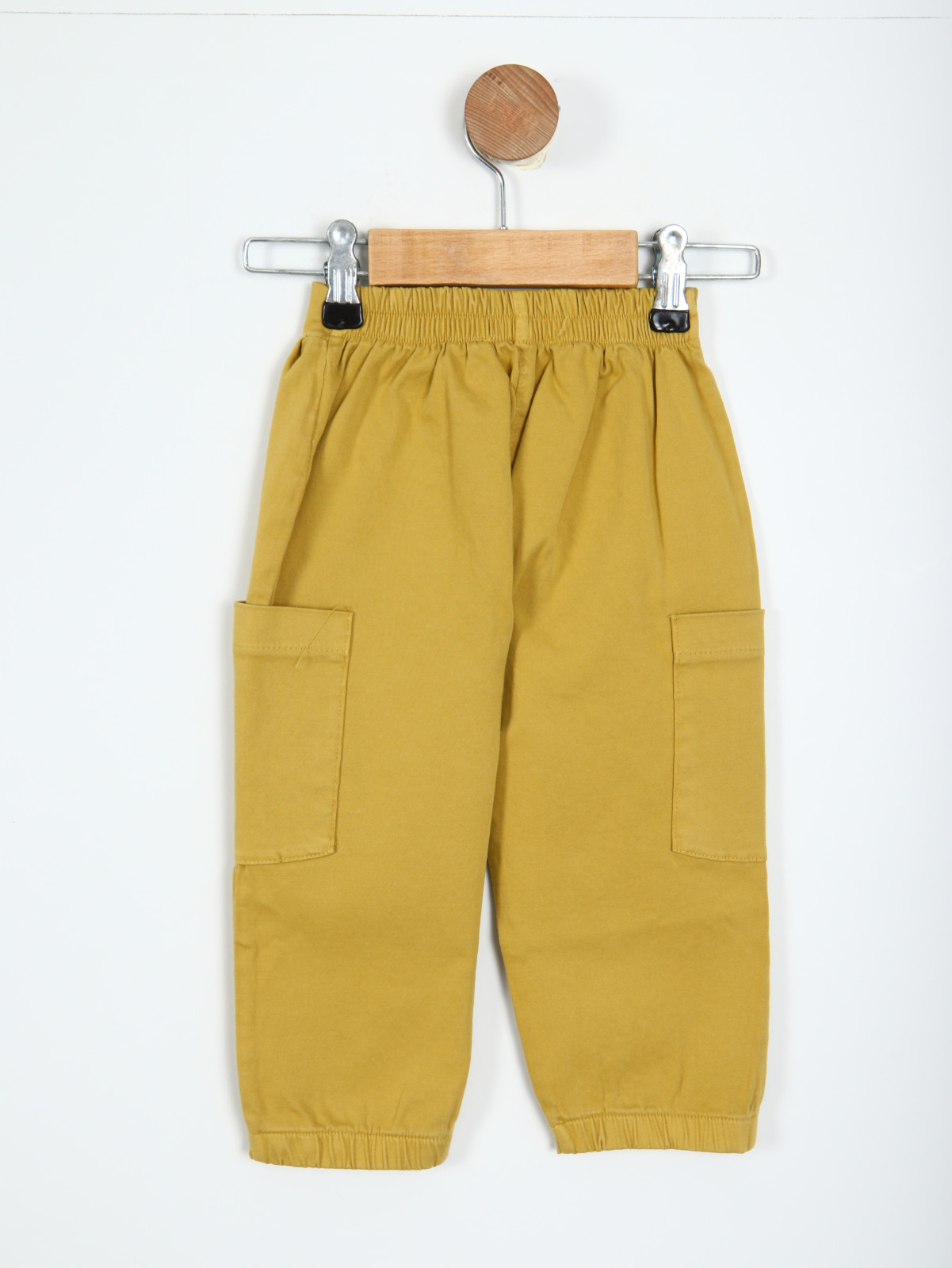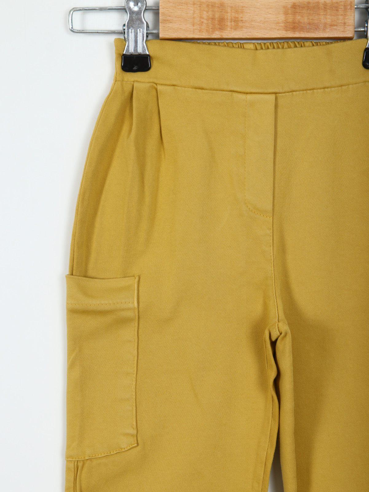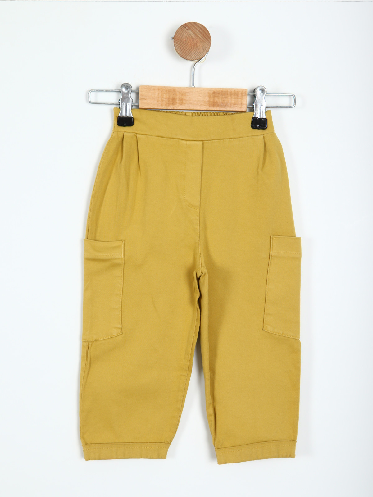 Bu kız çocuk pantolonu, rahat kesimi ve fonksiyonel cepleriyle günlük kullanım için mükemmeldir. Fermuarsız ve düğmesiz tasarımı sayesinde kolayca giyilip çıkarılabilir. Bel kısmındaki lastik detay, hareket özgürlüğü sağlarken, paçalarındaki lastik bitişler pantolonun kaymasını önler. Canlı hardal rengi, çocuk gardırobuna neşe katar.