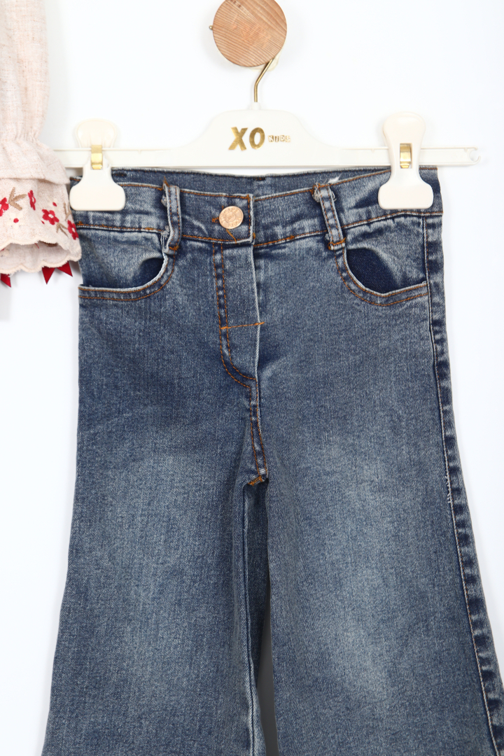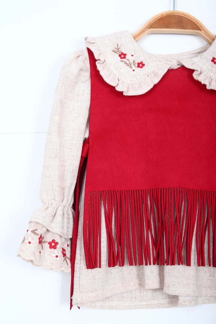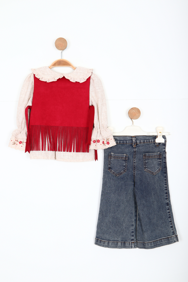 Gelince Haber VerBu kız çocuk alt üst takımı, hem şıklığı hem de rahatlığı bir arada sunar. Üst parça, uzun kollu ve fırfırlı yakası ile zarif bir görünüm sağlarken, kırmızı süet ön parçadaki püsküller oyuna neşeli bir hareket katıyor. Kol uçlarındaki ve yaka etrafındaki çiçek nakışları, kıyafete hoş bir detay ekliyor. Alt parça ise geniş paçalı, koyu denim pantolondur; hareket özgürlüğü sağlar ve günlük kullanıma uygundur. Takım, 9-14 yaş arası çocuklar için ideal bir seçimdir.