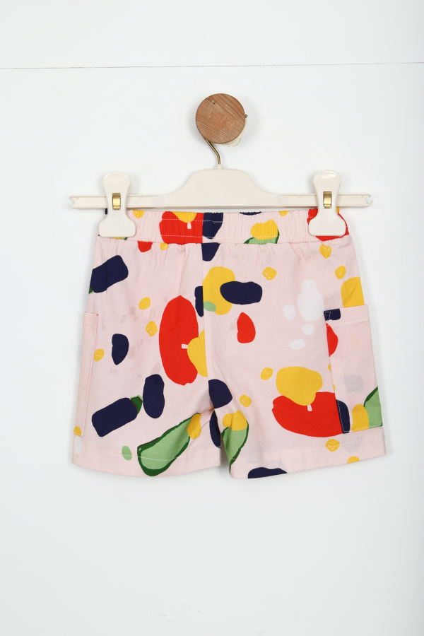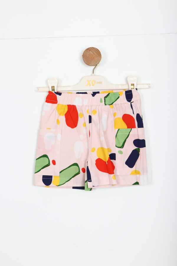 Bu kız çocuk şortu, yumuşak ve rahat bir kumaştan üretilmiş olup, yaz ayları için ideal bir seçenektir. Bel kısmında elastik bant bulunmakta, bu da kolay giyilip çıkarılmasını sağlar ve hareket özgürlüğü sunar. Şortun üzerinde parlak ve canlı renklerde soyut desenler yer almakta, bu da ona neşeli ve enerjik bir görünüm kazandırmaktadır. Her iki yan tarafında kullanışlı cepler bulunmakta, böylece küçük eşyalar rahatlıkla taşınabilir.