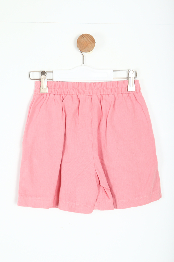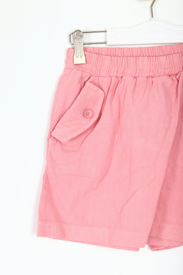Bu kız çocuk şortu, rahat ve şık tasarımıyla günlük kullanıma oldukça uygundur. Pembe tonlarında olan şort, elastik bel bandı sayesinde çocuklara konfor sağlar. Ön tarafında düğmeli cepler bulunur, bu da şortu hem fonksiyonel hem de dekoratif kılar. Diz üstü kısa boyuyla yaz ve bahar ayları için ideal bir seçimdir.