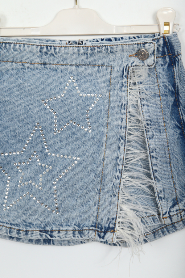 Bu kız çocuk için tasarlanmış mavi kot etek, şık ve rahat bir görünüm sunar. Etek, ön kısmında iki farklı boyutta yıldız desenleriyle süslenmiş ve taş detaylarla parıltı katılmıştır. Ön taraftaki açık yırtmaç kısmında ise modern bir dokunuş olarak tüy detayları kullanılmıştır. Arka kısmı ise elastik bel sayesinde çocukların rahat hareket etmesini sağlar. Kısa boyu ile yaz aylarında serin ve kullanışlıdır. Günlük kullanıma uygun, spor ve casual tarzda bir parçadır.