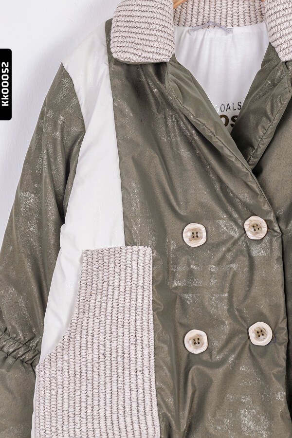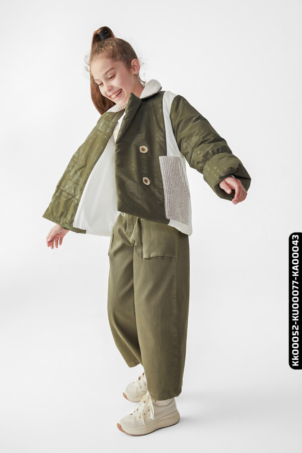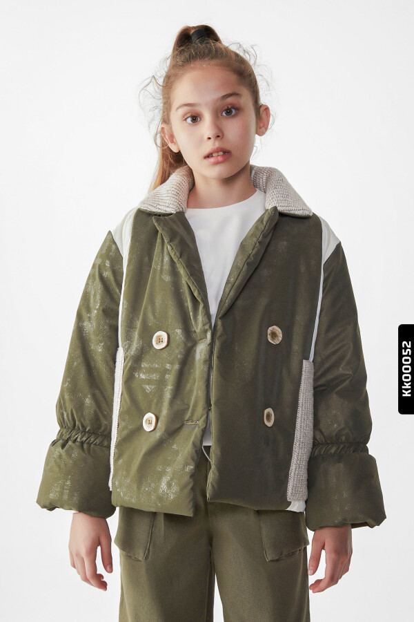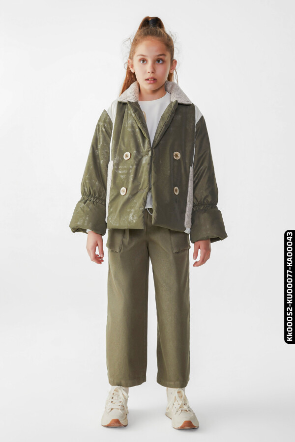 Bu kız çocuk montu, kış aylarında sıcak ve şık kalmak isteyenler için ideal bir seçimdir. Haki rengindeki mont, kapüşonsuzdur ve çift sıra büyük düğmelerle kapatılır. Uzun kollu ve rahat kesimli olan model, manşetlerde lastik detayıyla konforlu bir kullanım sunar. Montun yanlarında ve yakasında krem rengi peluş detayları bulunur, bu da ona sıcaklık ve özgünlük katar. Kısa boyu sayesinde hareket kabiliyetini kısıtlamaz, günlük kullanıma uygundur.