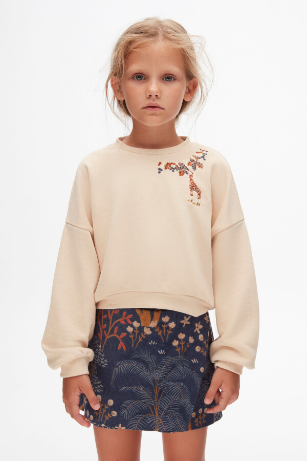 Bu kız çocuk sweatshirtü, kış sezonu için ideal, rahat ve şık bir tercihtir. Krem rengindeki sweatshirt, kapüşonsuz ve fermuarsız sade tasarımıyla dikkat çeker. Uzun kollu ve bisiklet yaka modelidir. Sweatshirtün ön kısmında, omuz hizasında renkli çiçekler ve bir zürafa figürü işlenmiştir. Kısa ve bol kesimi sayesinde hareket özgürlüğü sağlar. Manşet ve bel kısmındaki ribana detayları ürüne sportif ve rahat bir hava katmaktadır.