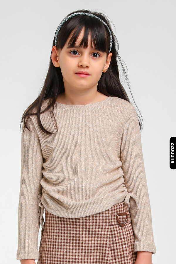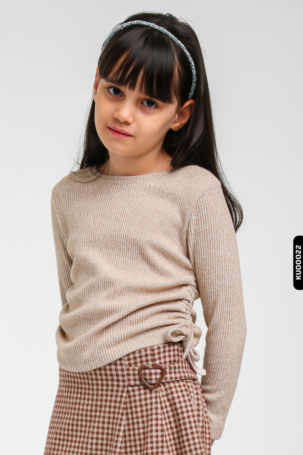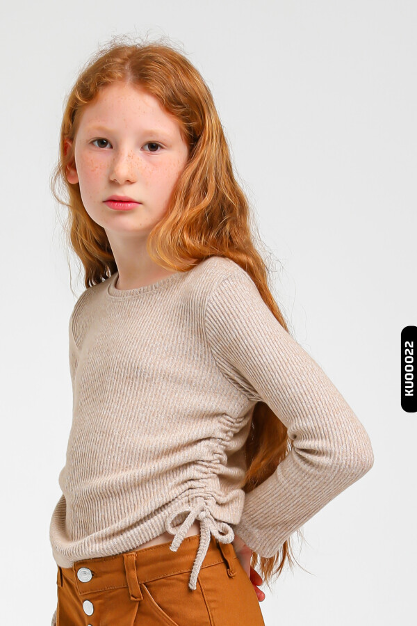 Bu kız çocuk kışlık kazak, rahatlığı ve şıklığı bir arada sunar. Bej rengi ve ince triko yapısı ile her kombinasyona uyum sağlayacak sade ama zarif bir tasarıma sahiptir. Uzun kollu ve sıfır yakalı olan bu kazak, yan taraflarında kordon detayları ile hoş bir hareket kazandırılmıştır. Hem günlük kullanıma hem de özel günlere uygun bu kazak, 9-14 yaş arası çocuklar için idealdir.