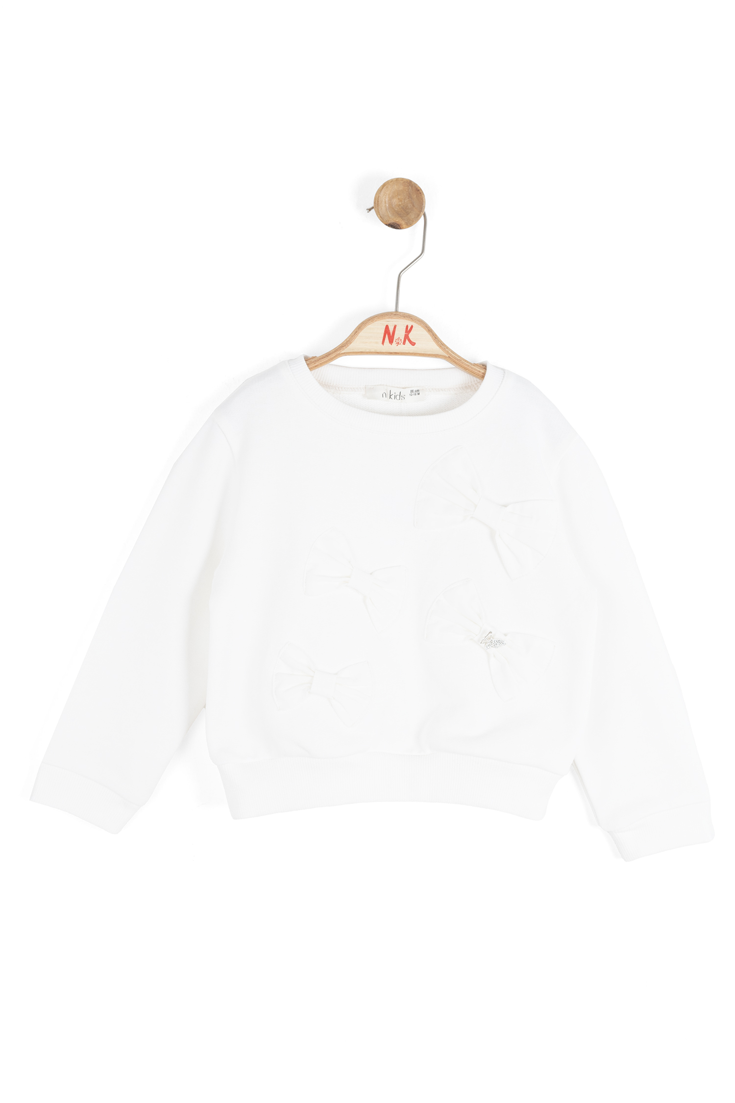 Bu kız çocuk sweatshirtü, ekru renginde ve sade tasarımıyla çocukların günlük giyiminde rahatlık ve şıklığı bir arada sunar. Kapüşonsuz ve fermuarsız olan model, yuvarlak bisiklet yaka yapısıyla kolayca giyilip çıkarılabilir. Uzun kollu ve kısa boylu olarak tasarlanmış bu sweatshirt, ön yüzünde bulunan şeffaf kumaştan yapılmış fiyonk detayları ile zarif bir görünüm kazanır. Cepli ya da kordonlu olmayan bu parça, hem günlük hem de özel günlerde tercih edilebilecek casual bir stil sunar.