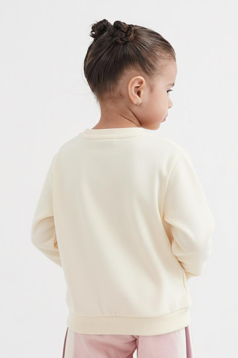 Bu kız çocuk sweatshirtü, krem rengiyle zarif ve sade bir görünüm sunar. Kapüşonsuz ve sıfır yakalı tasarımı sayesinde rahat bir kullanım sağlar. Uzun kollu yapısı, kış aylarında sıcak tutarken, sweatshirtün ön yüzü ve kollarda yer alan siyah şeritli krem renkli fiyonk süslemeleriyle şık ve eğlenceli bir detay kazandırılmıştır. Bel ve kol manşetleri ribanalıdır, bu da ekstra konfor ve uyum sağlar. Günlük kullanıma uygun, hem sportif hem de casual tarzda tercih edilebilir.