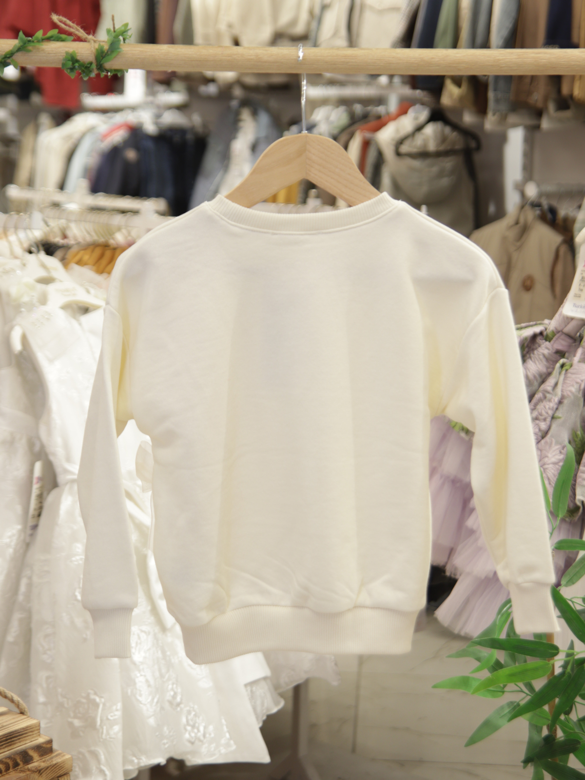 Bu krem rengi kız çocuk sweatshirtü, rahat ve şık tasarımıyla günlük kullanıma uygundur. Kapüşonsuz ve fermuarsız sade model, uzun kollu ve sıfır yakaya sahiptir. Sweatshirtün ön kısmında büyük, pembe tonlarında bir kelebek baskısı bulunur ve kelebek detayında transparan beyaz bir fiyonk aksesuarı yer alır. Rahat kesimi ve elastik manşetleri sayesinde çocukların hareket özgürlüğünü kısıtlamaz. Günlük spor ve rahat kombinler için ideal bir tercih.