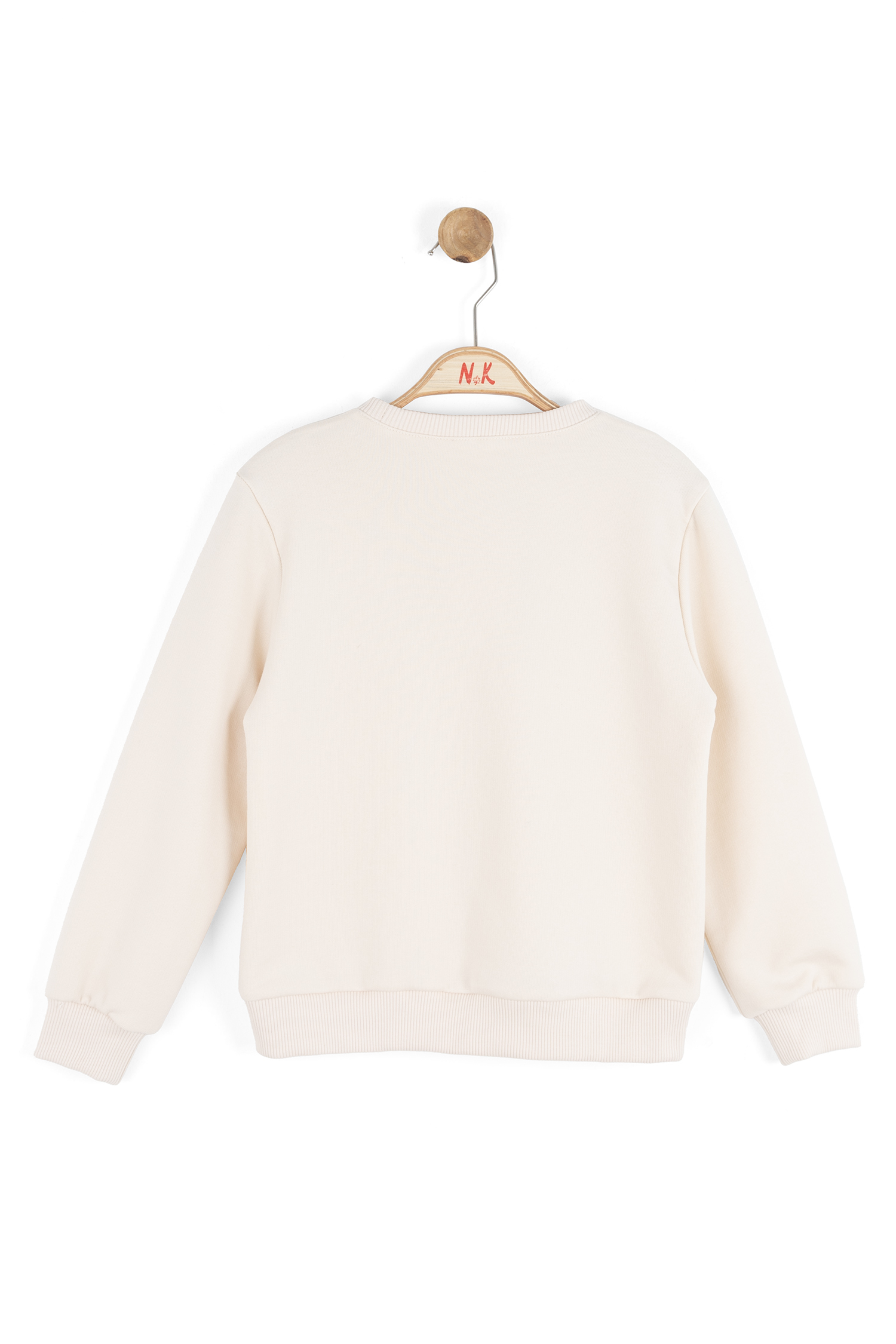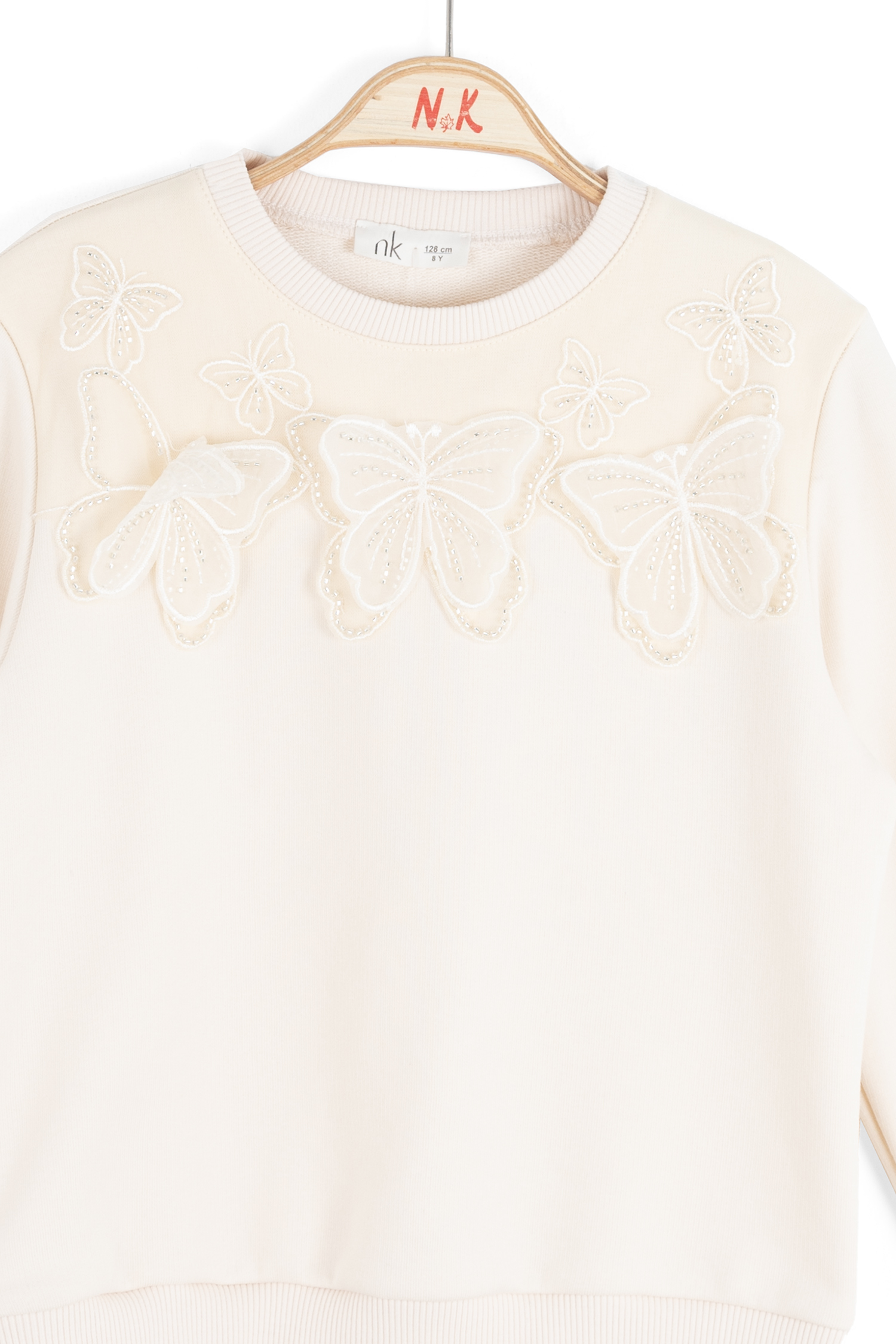Bu krem rengi kız çocuk sweatshirtü, rahat kesimi ve şık tasarımıyla günlük kullanıma uygundur. Kapüşon bulunmayan model, sıfır yaka ve uzun kollu yapısıyla konfor sağlar. Sweatshirtün ön kısmında yer alan 3 boyutlu kelebek aplikeleri ve inci detayları, ürüne zarif ve eğlenceli bir hava katmaktadır. Yan cepler veya fermuar gibi detaylar bulunmamaktadır. Alt ve kol manşetlerinde ribana kumaş kullanılarak ürünün oturması ve sıcak tutulması hedeflenmiştir. 9-14 yaş aralığındaki çocuklar için idealdir.
