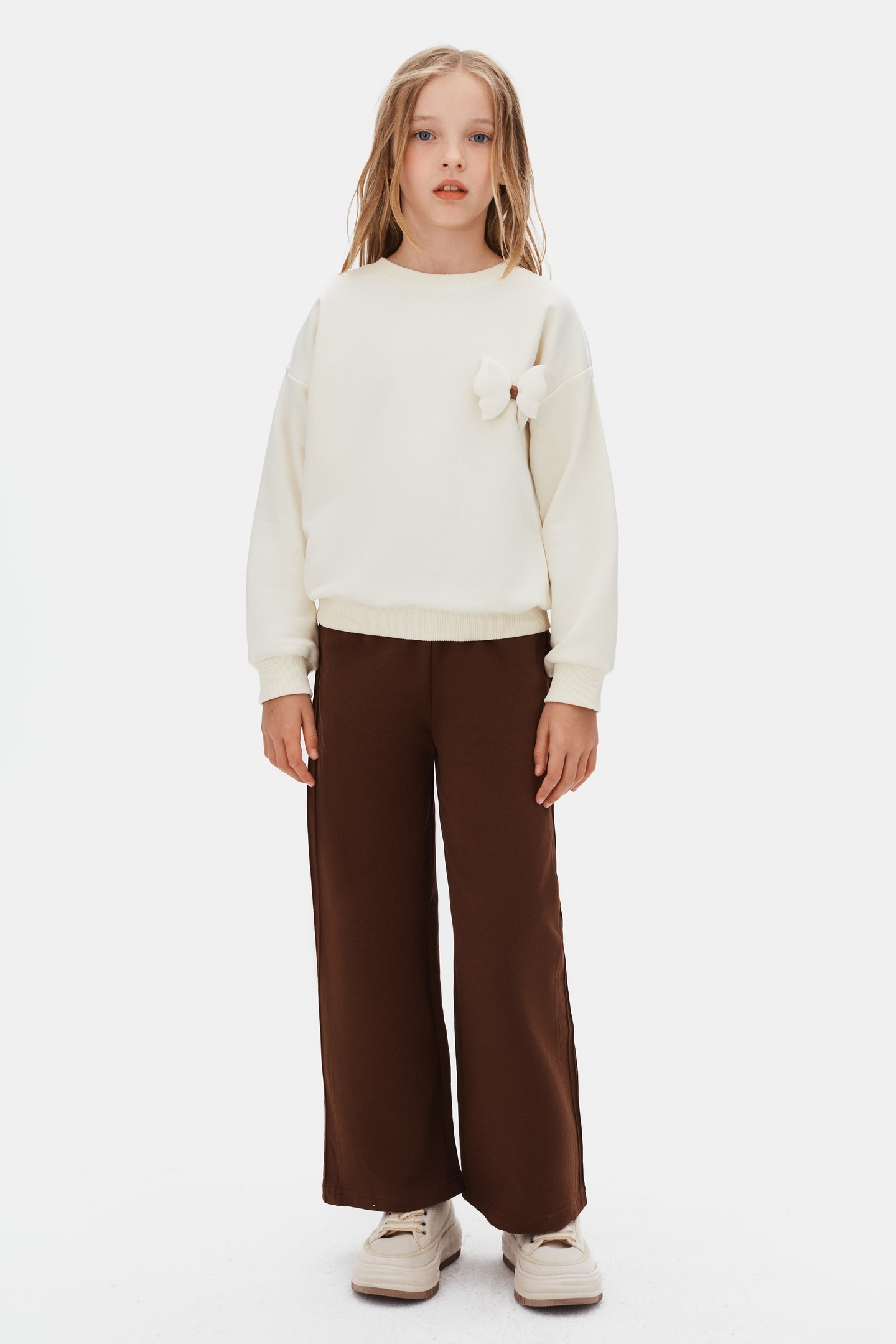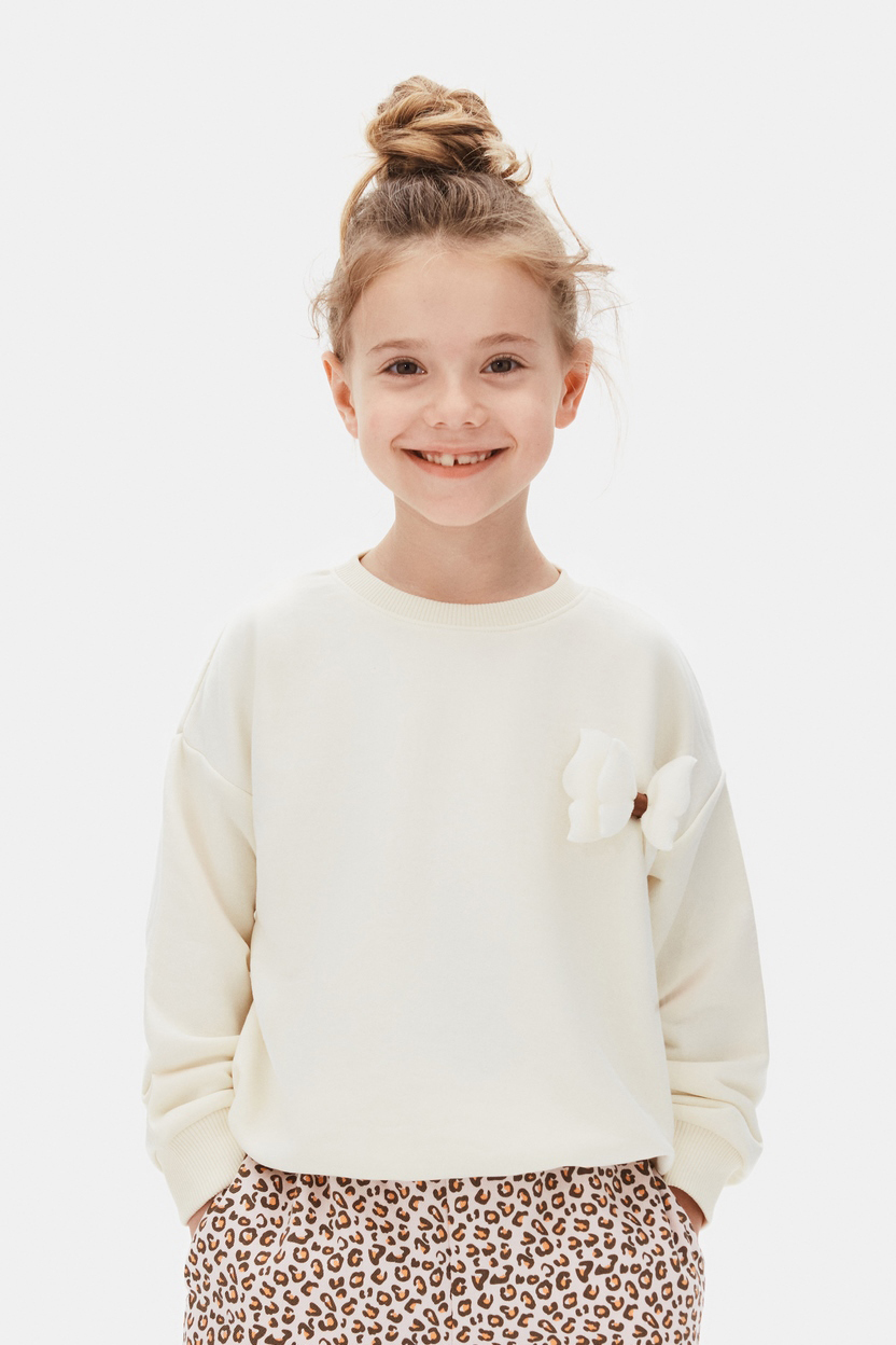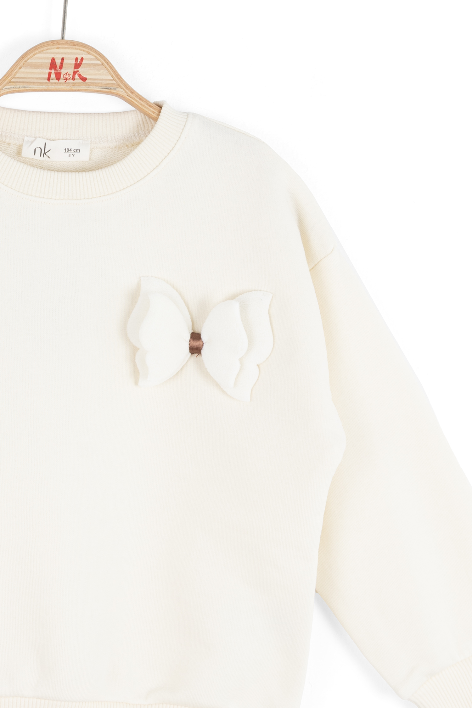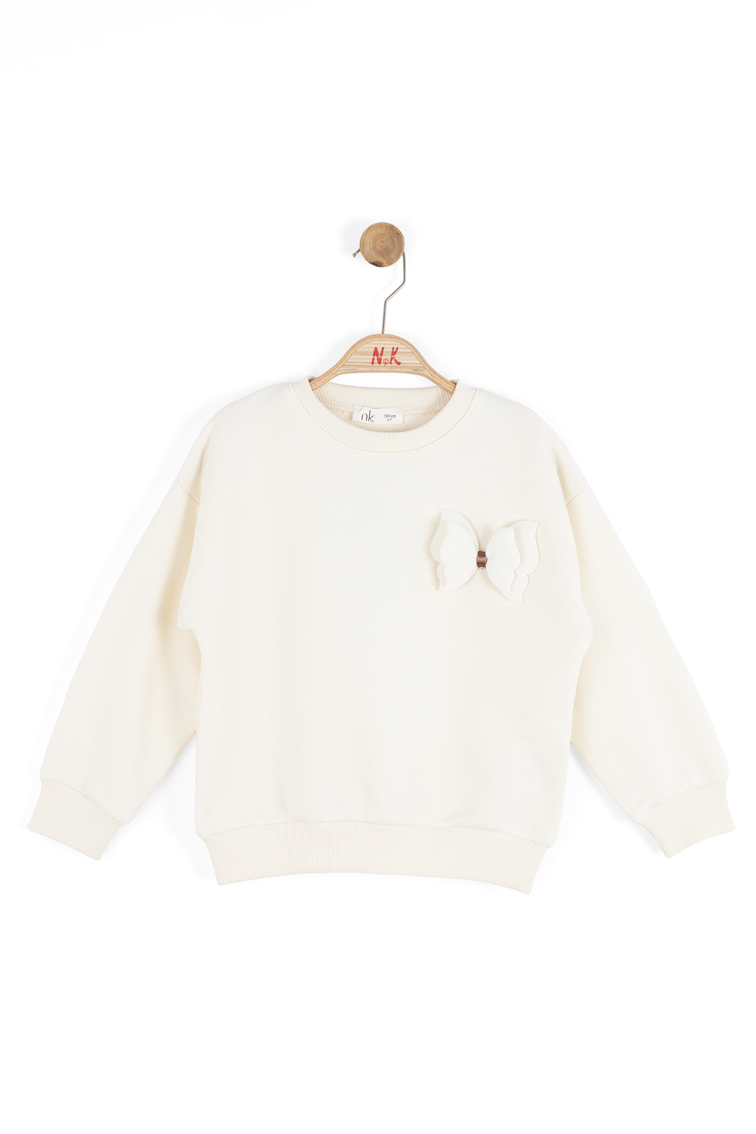 هذا السويت شيرت للبنات يتميز بتصميم بسيط وأنيق مناسب للاستخدام اليومي. بلون كريمي، بأكمام طويلة وياقة دائرية لتوفير راحة أثناء الارتداء. يحتوي على زينة فراشة ناعمة باللون الوردي على الجهة الأمامية تضيف لمسة لطيفة وفريدة. لا يحتوي على سحاب أو أزرار أو جيوب أو أربطة، مما يتيح حرية الحركة بسهولة. الأساور عند الأكمام والحافة مرنة للحفاظ على شكل القطعة.