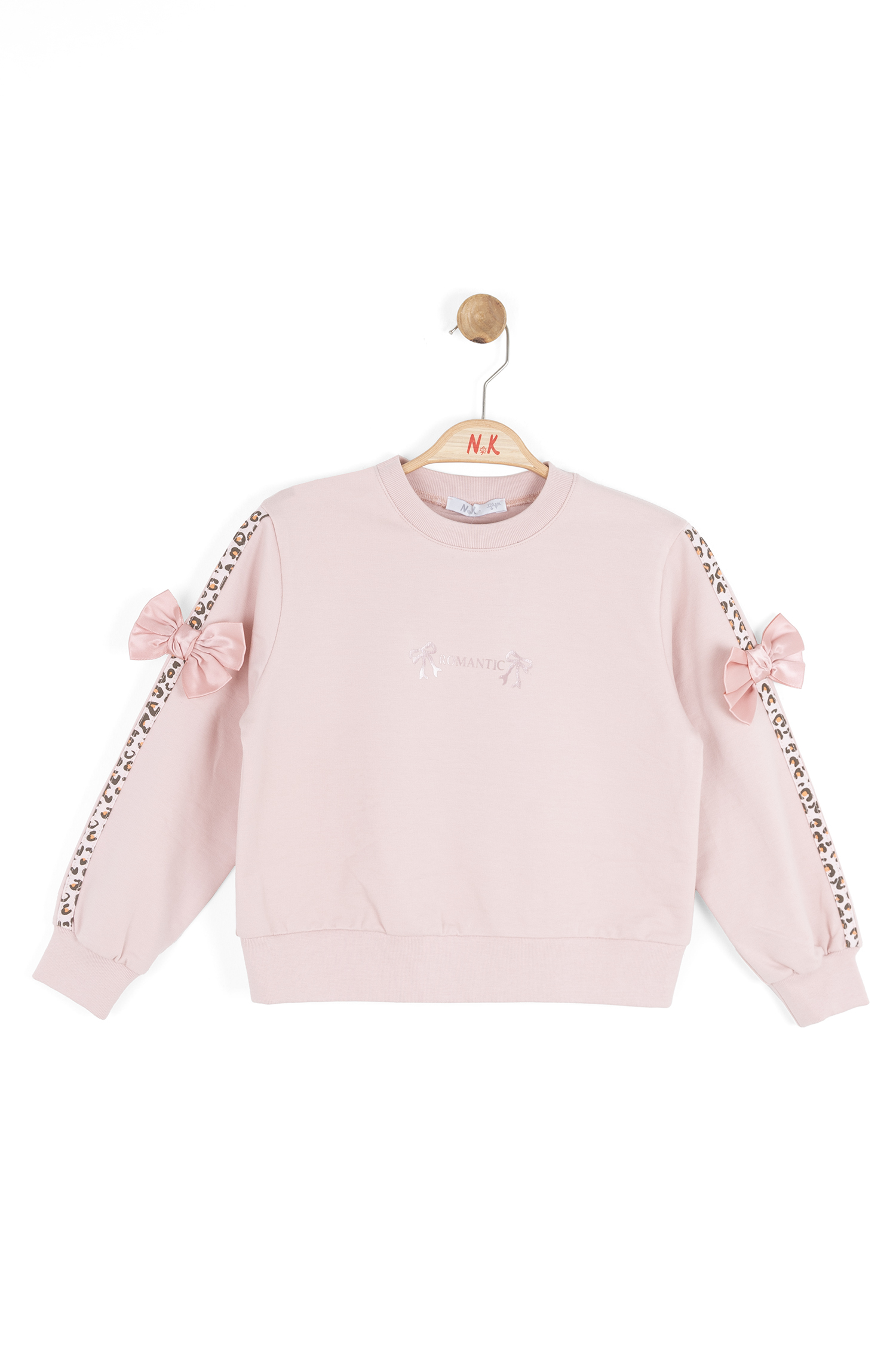 Bu kız çocuk sweatshirtü, şık ve rahat tasarımı ile günlük kullanıma uygundur. Pudra rengindeki sweatshirt, uzun kollu ve sıfır yakalıdır. Kollarında leopar desenli şeritler ve pembe saten fiyonk detayları bulunmaktadır. Ön kısmında ise hafif tonlarda işlenmiş "Romantic" yazısı ve küçük fiyonk figürleri yer almaktadır. Elastik ribana manşetleri ve bel kısmı, hareket rahatlığı sağlar. Kapüşonsuz ve fermuarsız sade bir modeldir.