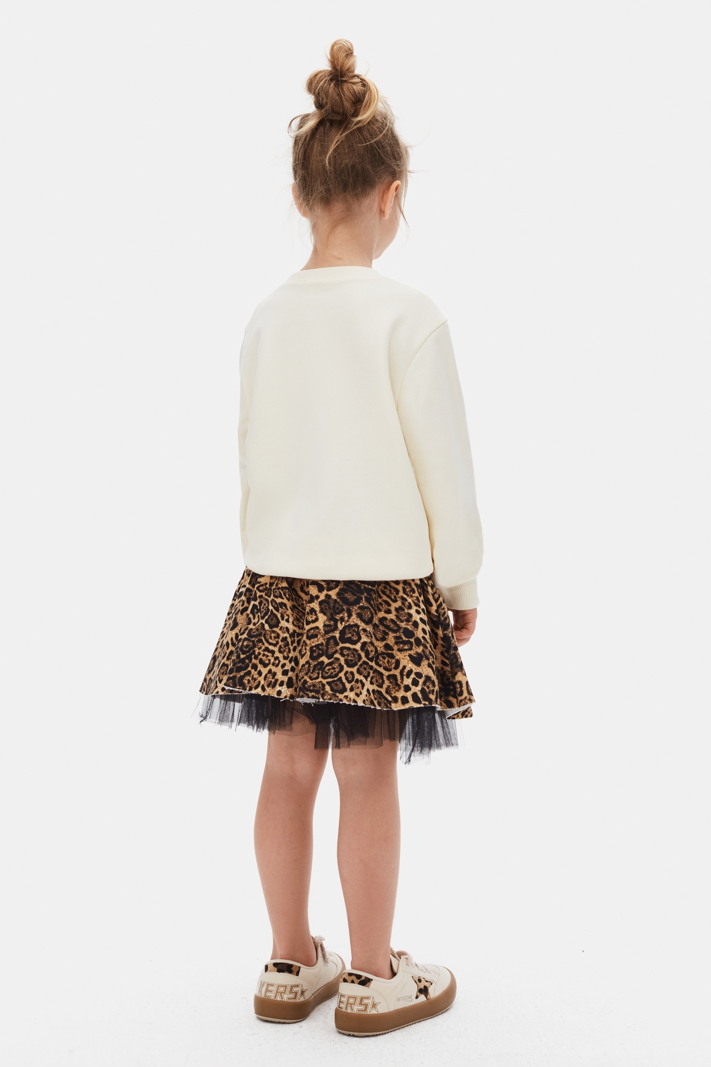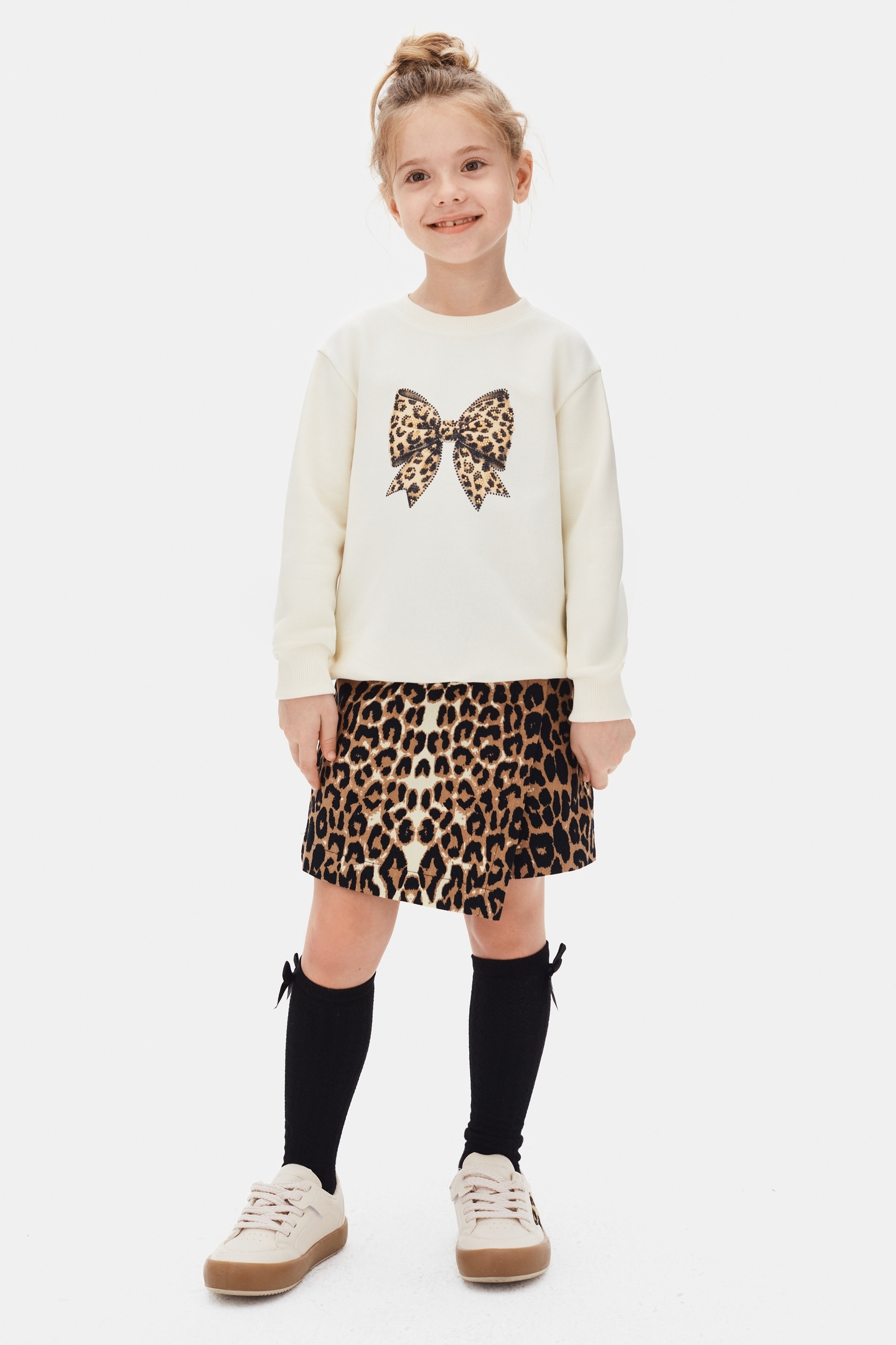 Bu kız çocuk sweatshirt'ü, rahat ve şık tasarımı ile günlük kullanıma uygundur. Kapüşonsuz ve fermuarsız olan ürün, sade krem rengindedir ve ön kısmında büyük, leopar desenli bir fiyonk baskısı bulunmaktadır. Uzun kollu ve sıfır yakalı yapısı sayesinde çocukların rahat hareket etmesini sağlar. Sweatshirt, günlük ve casual kombinler için ideal bir tercih olup, yumuşak kumaşı ile konfor sunar.