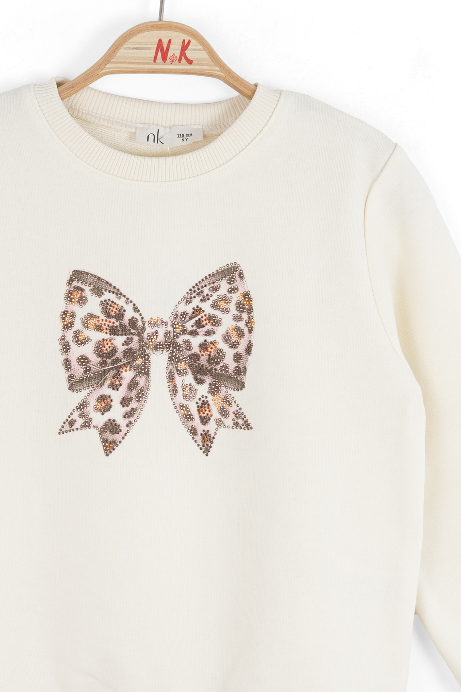 Bu kız çocuk sweatshirt'ü, rahat ve şık tasarımı ile günlük kullanıma uygundur. Kapüşonsuz ve fermuarsız olan ürün, sade krem rengindedir ve ön kısmında büyük, leopar desenli bir fiyonk baskısı bulunmaktadır. Uzun kollu ve sıfır yakalı yapısı sayesinde çocukların rahat hareket etmesini sağlar. Sweatshirt, günlük ve casual kombinler için ideal bir tercih olup, yumuşak kumaşı ile konfor sunar.