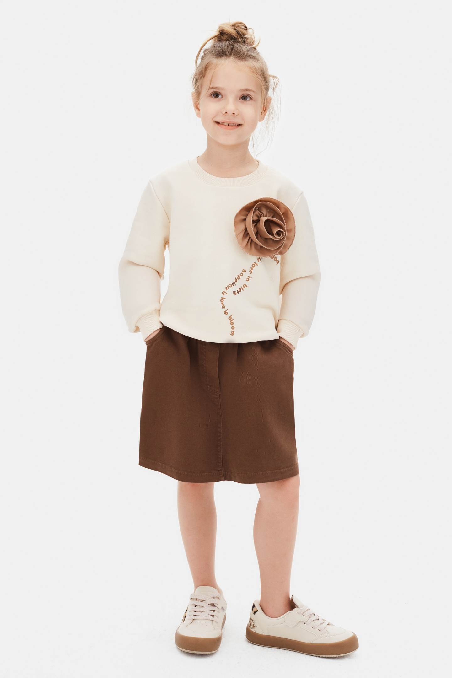 Bu kız çocuk sweatshirt'ü, sade ve şık tasarımıyla dikkat çekiyor. Kapüşonsuz ve sıfır yakalı olan ürün, uzun kollu yapısı ile serin havalarda rahatlık sunar. Ön kısmında kahverengi tonlarında, kumaştan yapılmış büyük bir çiçek detayı yer alır. Çiçeğin sapını andıran kıvrımlı yazılar ise ürüne özgünlük katmaktadır. Cepli ya da fermuarlı olmayan, sade yapısıyla günlük kullanıma uygun, rahat bir modeldir.