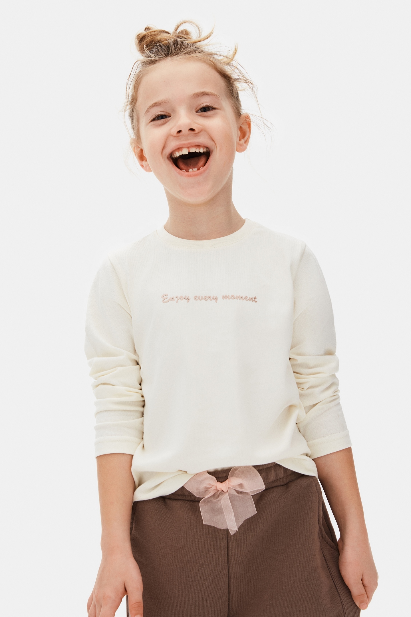 Bu kız çocuk sweatshirt modeli, sade ve şık tasarımı ile günlük kullanıma uygundur. Krem rengi ve uzun kollu yapısı ile kış mevsimine ideal bir seçimdir. Sıfır yaka kesimi sayesinde rahat bir kullanım sunar. Sweatshirt üzerinde "Enjoy every moment" yazısı hafif kabartmalı ve pastel tonlarda işlenmiştir. Ürün kapüşonsuzdur ve fermuar ya da düğme bulunmamaktadır. Alt kısmı düz kesimdir ve cepsizdir.