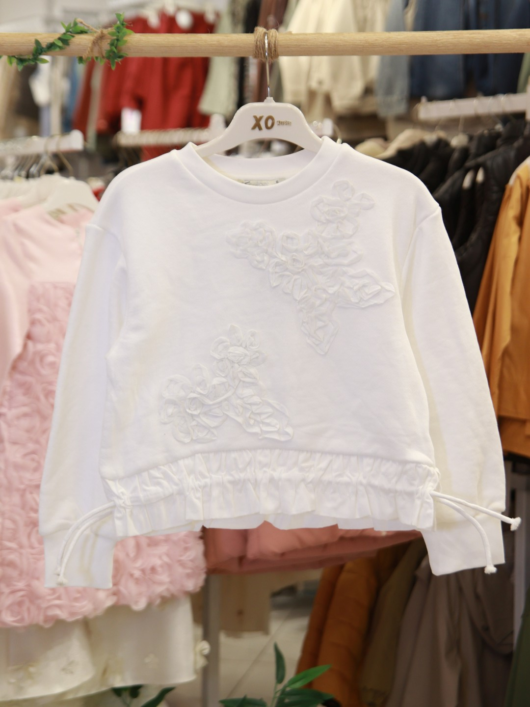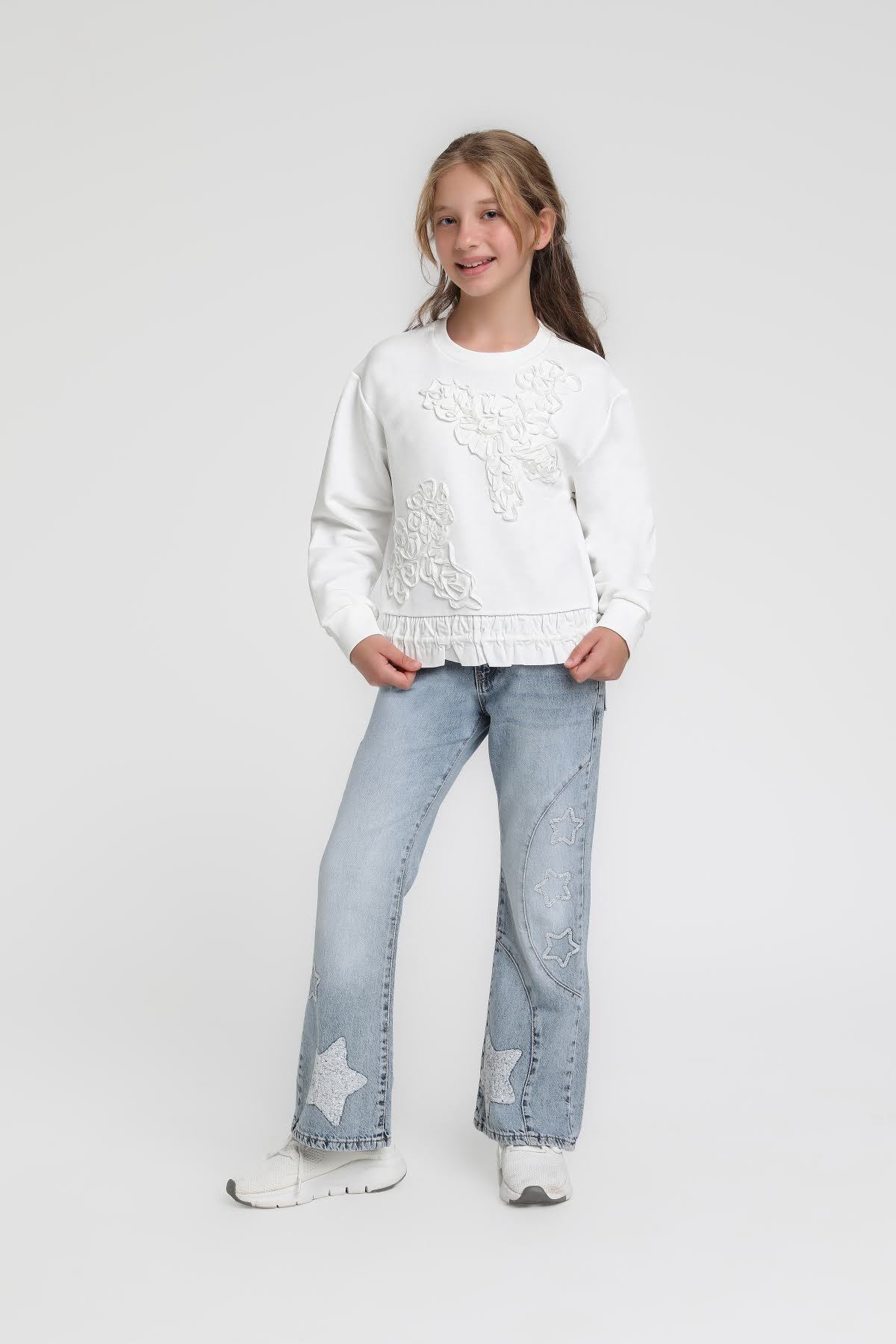 هذا السويت شيرت للبنات يتميز بلونه الأبيض النقي الذي يتناسب مع أي خزانة ملابس. تصميمه بدون قبعة وبدون سحاب، مما يوفر راحة في الارتداء. بأكمام طويلة وياقة دائرية، يجمع بين الراحة والأناقة بسهولة. يحتوي على نقوش زهرية بارزة في الأمام وتفاصيل كشكش عند الحافة السفلى. لا يحتوي على جيوب أو أربطة، مما يجعله قطعة مثالية للإطلالات اليومية والأنيقة.