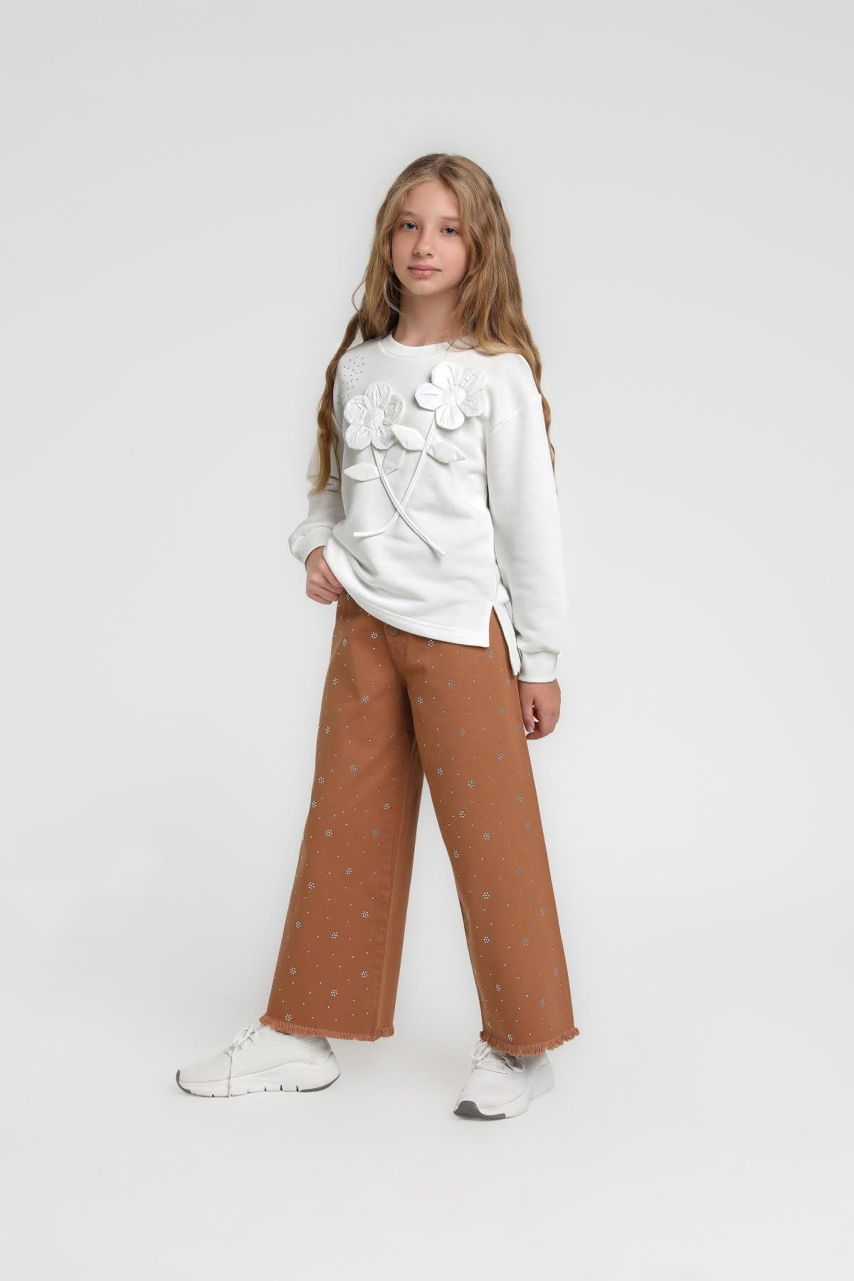 هذا السويتشيرت للبنات هو قطعة أساسية لخزانة الشتاء بتصميمه البسيط والأنيق. يتميز بدون قبعة وياقة دائرية وأكمام طويلة، مما يوفر راحة وعملية في نفس الوقت. يحتوي الجزء الأمامي على نقشين بارزين على شكل زهور كبيرة، مع فتحات جانبية صغيرة تضيف لمسة أنيقة. لونه الأبيض يسهل تنسيقه مع مختلف الملابس. مثالي للإطلالات اليومية والكاجوال الرياضية.