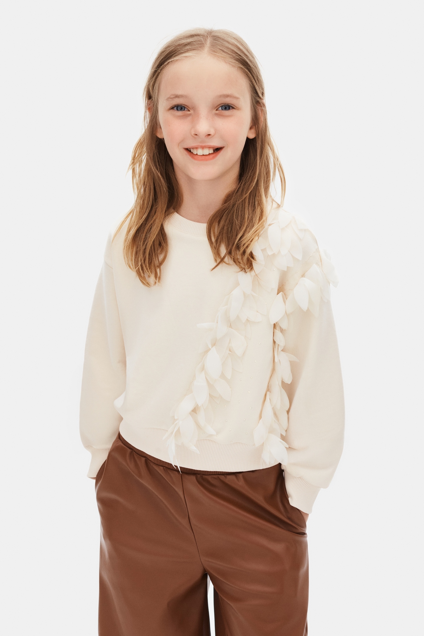 Bu krem rengi kız çocuk sweatshirt, sade ve şık tasarımıyla dikkat çekiyor. Kapüşonsuz ve fermuarsız olan ürün, bisiklet yaka ve uzun kollu yapısıyla soğuk kış günleri için ideal. Sweatshirt’ün öne çıkan özelliği, sağ omuzdan başlayıp gövdeye doğru uzanan, katmanlı yaprak figürlerinden oluşan zarif süslemeleri. Rahat kesimi ve yumuşak dokusuyla günlük kullanıma uygun, aynı zamanda özel günlerde de tercih edilebilecek bir modeldir.