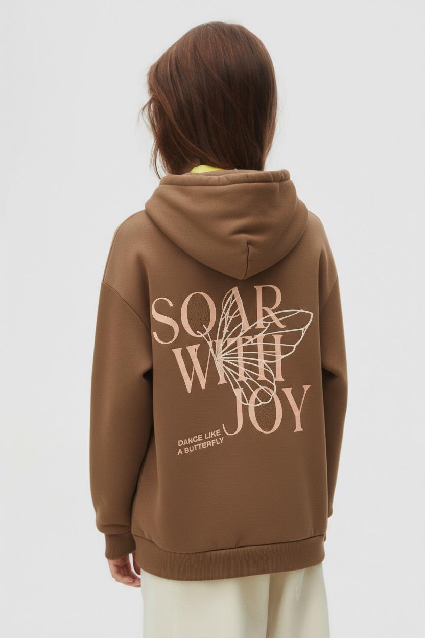 Bu kız çocuk sweatshirtü, sıcak kahverengi rengi ve rahat kesimiyle günlük kullanım için idealdir. Kapüşonlu yapısı sayesinde ekstra koruma sunar. Ön yüzünde "DANCE LIKE A BUTTERFLY" yazısı ve etrafında küçük boncuk detayı ile şık ve eğlenceli bir görünüm sağlar. Uzun kollu ve ribana manşetlere sahip olan sweatshirt, rahat hareket özgürlüğü sunar. Spor ve casual tarzı bir araya getirerek çocukların enerjisine uygun bir tasarım ortaya çıkarır.