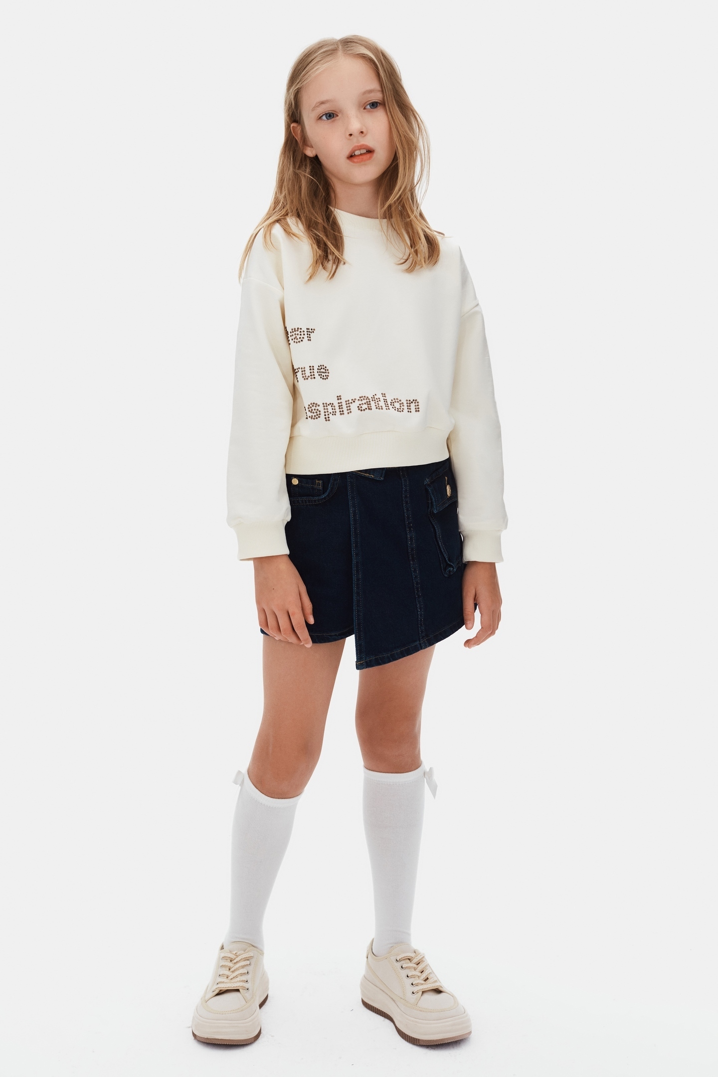 هذه البلوزة للأطفال البنات مثالية للاستخدام اليومي بتصميمها البسيط والأنيق. تتميز بعدم وجود قبعة أو سحاب لتوفير الراحة. البلوزة بأكمام طويلة وياقة دائرية، بلون كريمي. توجد كتابة مزينة بحبات صغيرة على الجزء الأمامي تحمل عبارة "Best True Inspiration". الأساور والحزام مزودة بقماش مضلع لزيادة الراحة وسهولة الحركة.