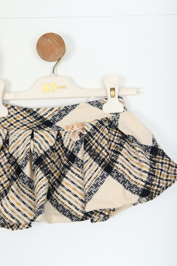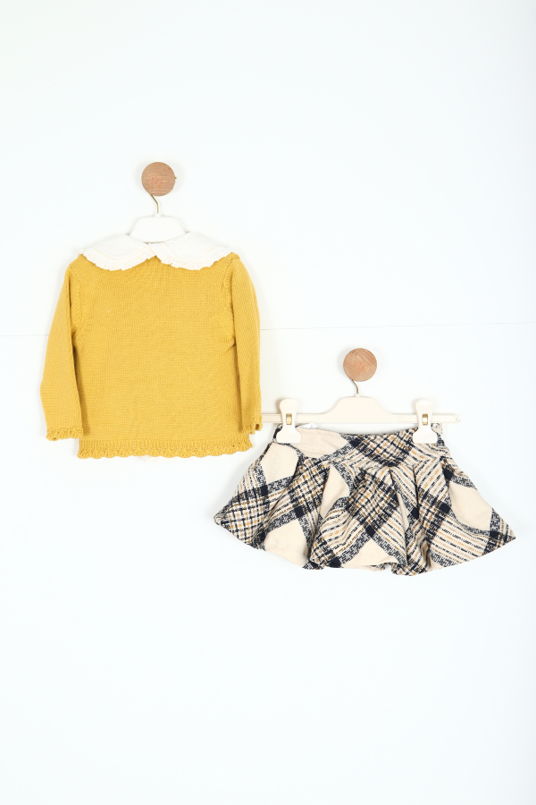 Bu şık kız çocuk eteği ve hırka takımında rahatlık ve zarafet bir arada sunuluyor. Sarı renkli, uzun kollu hırka düğmeli olup, ön kısmında örgü detayları ve uç kısmında fırfırlı dantel süslemeleri bulunuyor. Beyaz, fırfırlı ve çiçek işlemeli yakası ile dikkat çekiyor. Etek ise krem, lacivert ve sarı tonlarında kareli desenli, kısa ve hafif pileli yapısıyla hareketli bir görünüm sağlıyor. Hem günlük hem özel günler için ideal bir set.