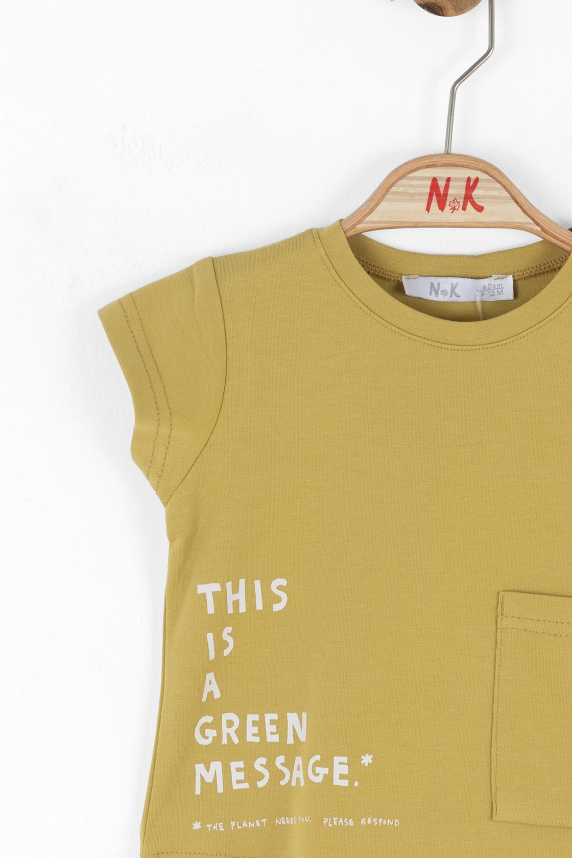 Bu kız çocuk tişörtü, sade ve şık tasarımıyla günlük kullanım için idealdir. Kısa kollu ve bisiklet yaka yapısıyla yaz aylarında rahatlıkla tercih edilebilir. Ön tarafında bulunan küçük cep, hem şıklık hem de kullanışlılık sağlar. Tişörtün yan kısmında yer alan beyaz baskı yazısı "This is a green message." çevre bilincini yansıtıyor. Canlı yeşil tonundaki kumaşı çocukların enerjisini ve neşesini yansıtır. Yumuşak ve nefes alabilen kumaşı sayesinde çocuklarınızın konforu ön plandadır.