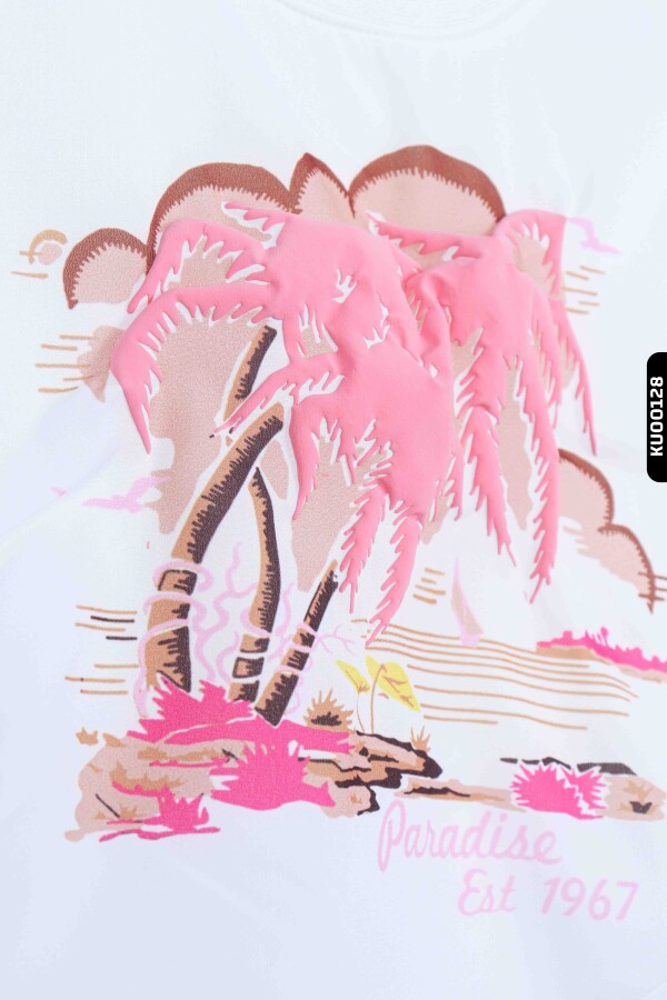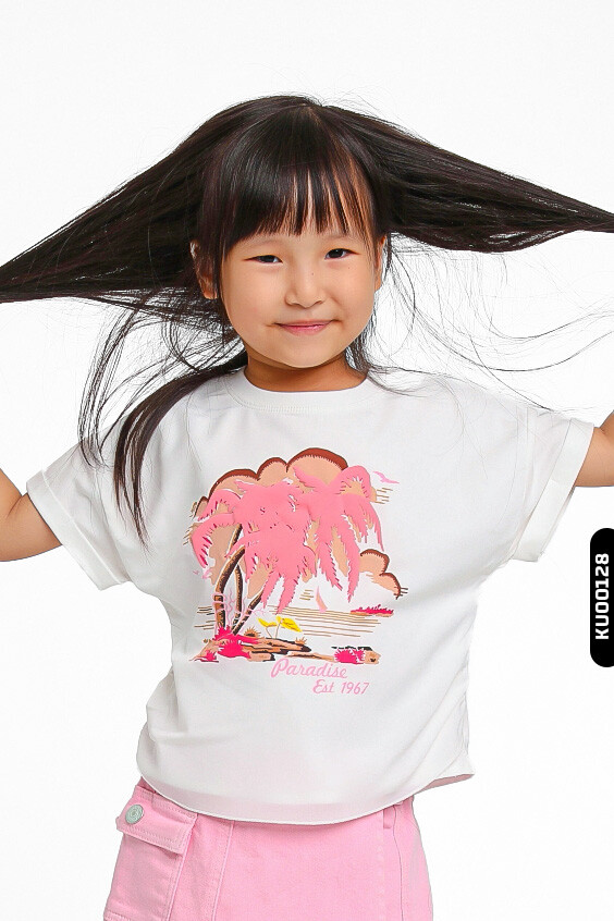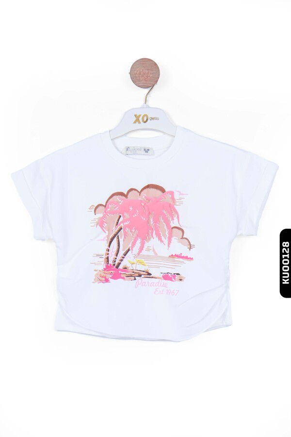 Gelince Haber VerBu kız çocuk tişörtü, yaz ayları için ideal, rahat ve şık bir seçenektir. Sıfır yaka ve kısa kollu yapısı sayesinde çocukların hareket özgürlüğünü kısıtlamaz. Ön kısmında yaz ve plaj temalı pembe ve kahverengi tonlarında tropikal palmiye ağaçları baskısı bulunmaktadır. Tişört, beyaz zemin üzerine canlı renklerle tasarlanmıştır ve günlük kullanım için uygundur. Hafif ve nefes alabilen kumaşı ile sıcak havalarda serin kalmayı sağlar.