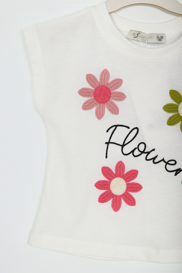Bu kız çocuk tişörtü, yaz ayları için mükemmel bir tercih. Beyaz renkte, kısa kollu ve bisiklet yakalı tasarımı ile rahatlık sağlar. Ön yüzünde renkli çiçek işlemeleri ve "Flowers" yazısı bulunur. Yumuşak ve hafif kumaşı sayesinde çocukların hareket özgürlüğünü kısıtlamaz. Günlük kullanım için ideal, şık ve eğlenceli bir görünüme sahiptir.