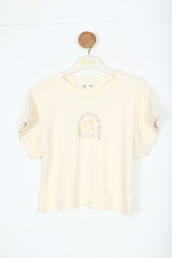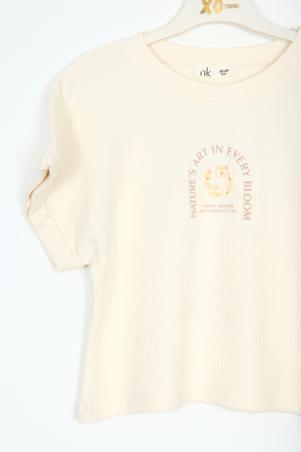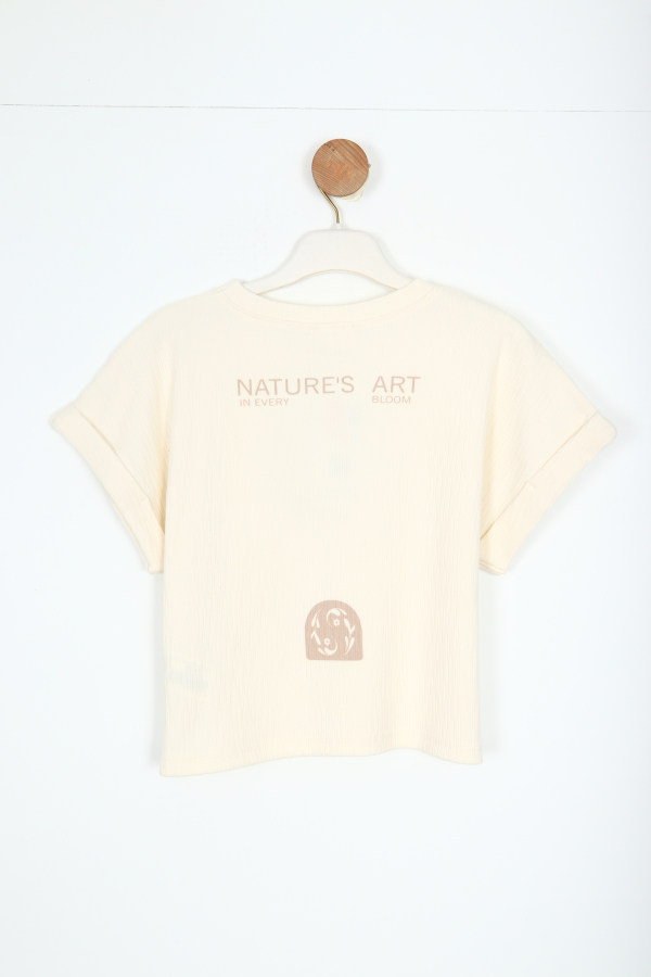Doğal krem rengiyle sade ve şık bir görünüm sunan bu kız çocuk tişörtü, günlük kullanıma çok uygundur. Kısa kollu ve bisiklet yaka tasarımıyla rahat bir kullanım sağlar. Omuzlarda hafif kıvrılmış detaylar, tişörte zarif bir dokunuş katarken, ön ve arka yüzeyde yer alan "Nature’s Art in Every Bloom" yazısı ve çiçek desenleri doğal temayı vurgular. Yumuşak ve hafif dokusu sayesinde çocukların konforunu ön planda tutar.