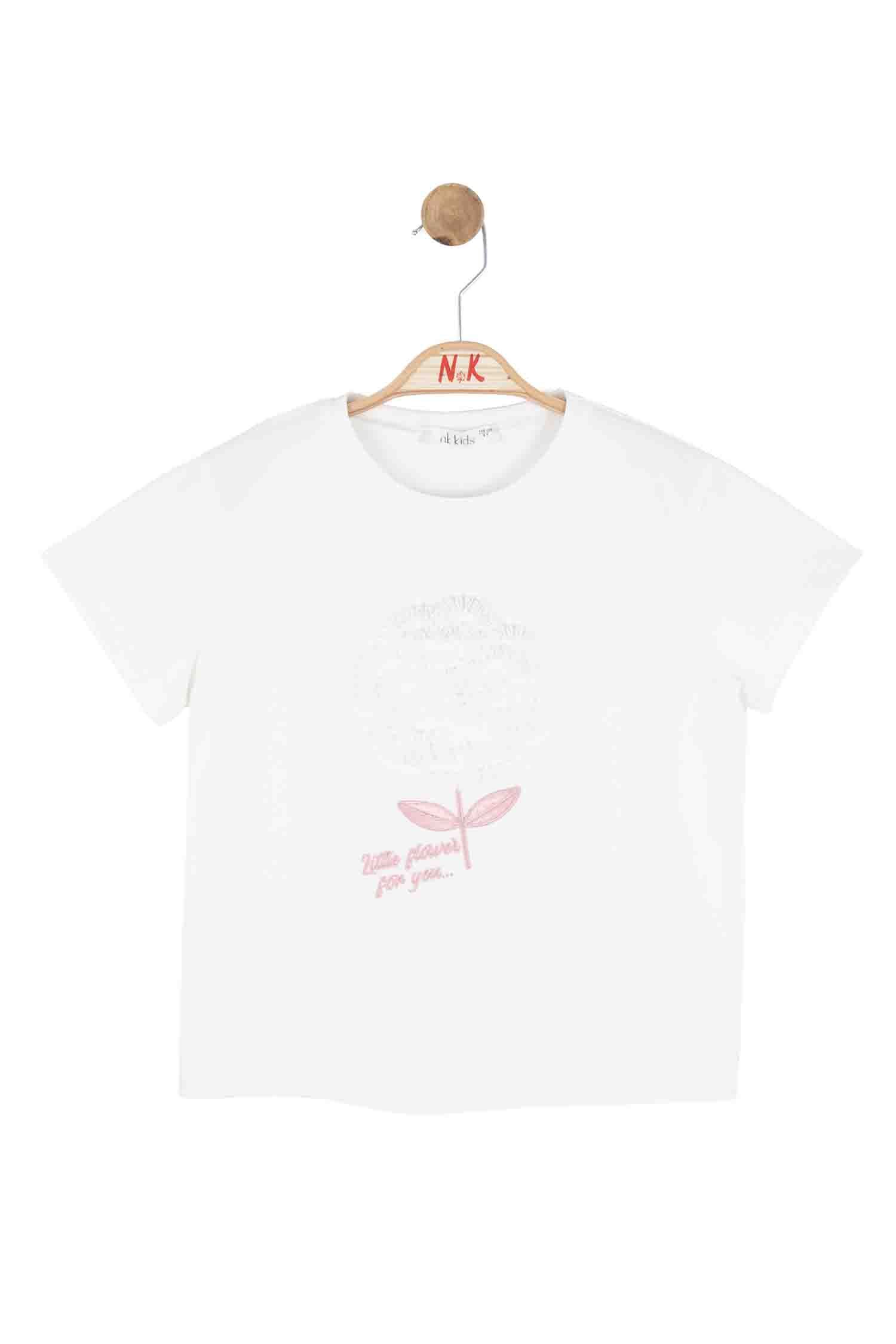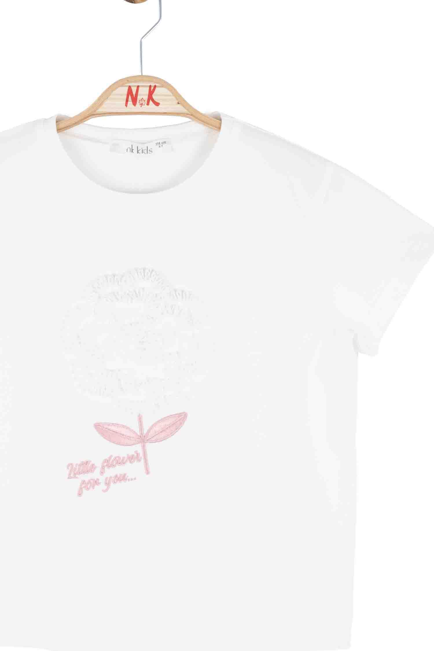 Bu kız çocuk tişörtü, bahar ayları için ideal hafif ve rahat bir üründür. Kapüşonsuz ve kısa kollu tasarımıyla sıcak havalarda konfor sağlar. Sıfır yakalı sade kesimi, günlük kullanım için uygundur. Tişörtün ön yüzünde, kabartmalı ve işlemeli büyük bir çiçek deseni bulunmaktadır. Altında "Little flower for you..." yazısı yer alır. Beyaz zemin, tişörtü her kombinle uyumlu hale getirir.
