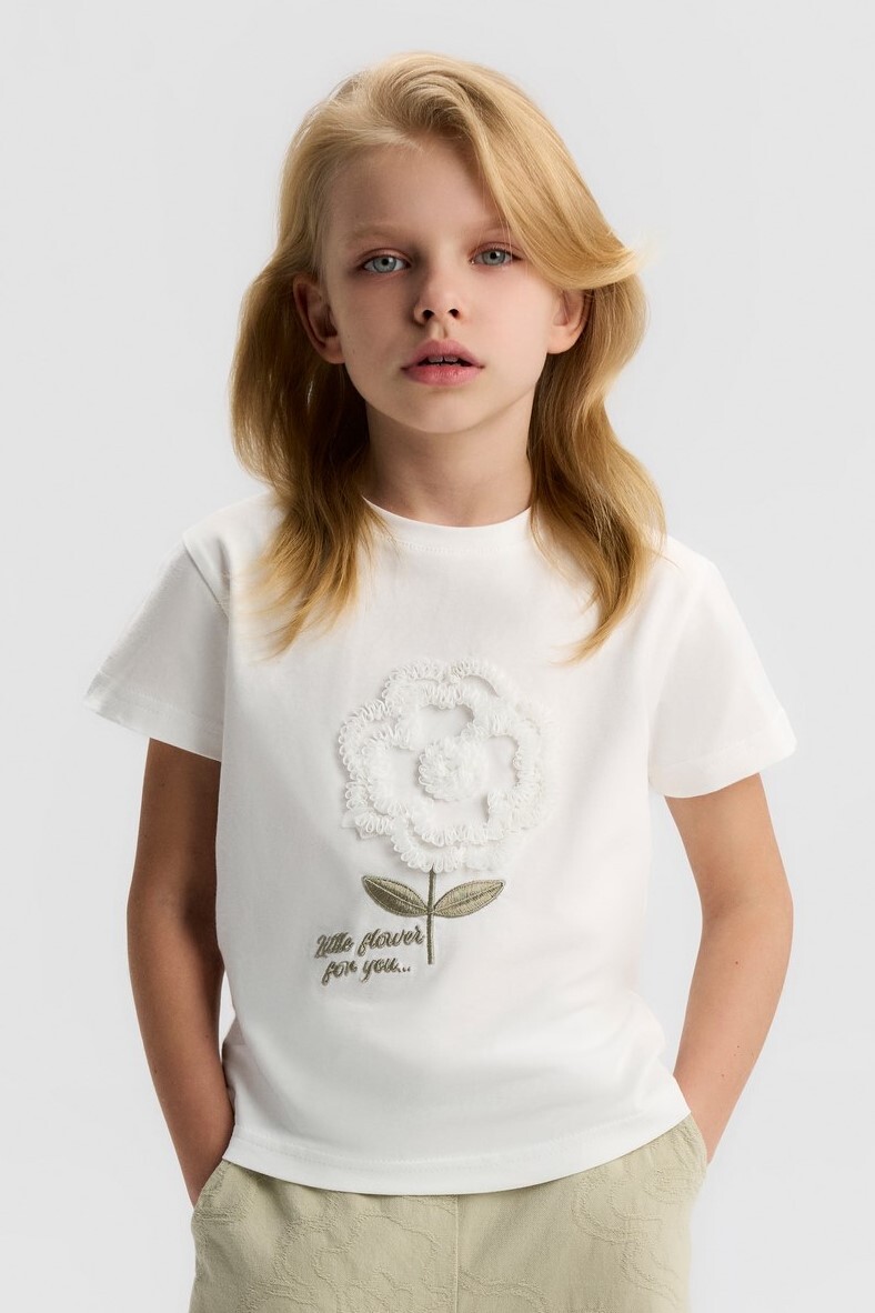 Bu kız çocuk tişörtü, hafif ve rahat yapısıyla bahar ayları için idealdir. Kabartmalı çiçek deseni ve sade beyaz tasarımı günlük kullanım için uygundur. Konforlu tişörtü keşfedin, her kombine uyum sağlar.