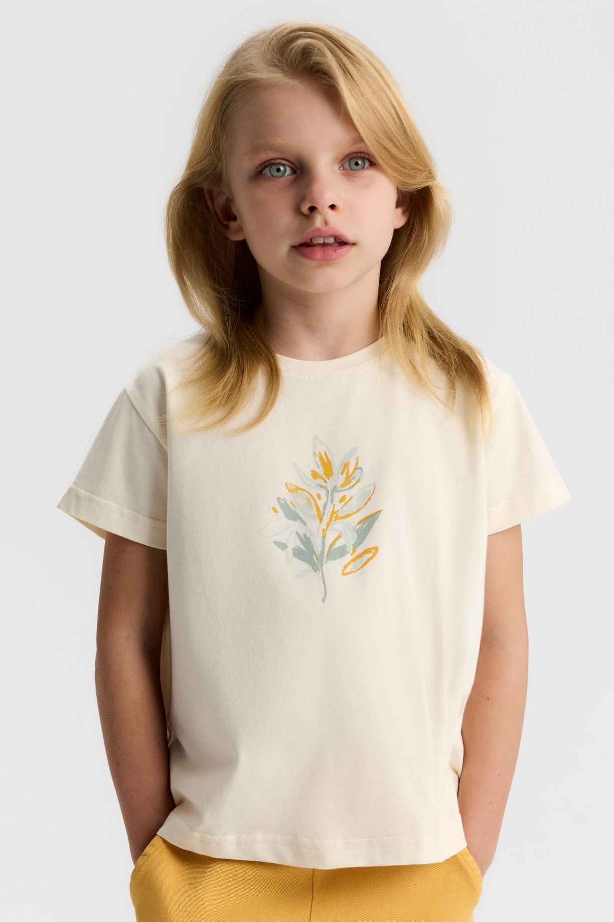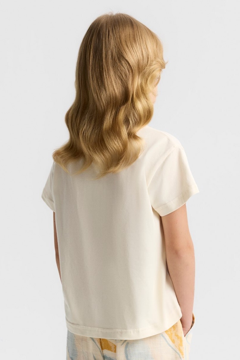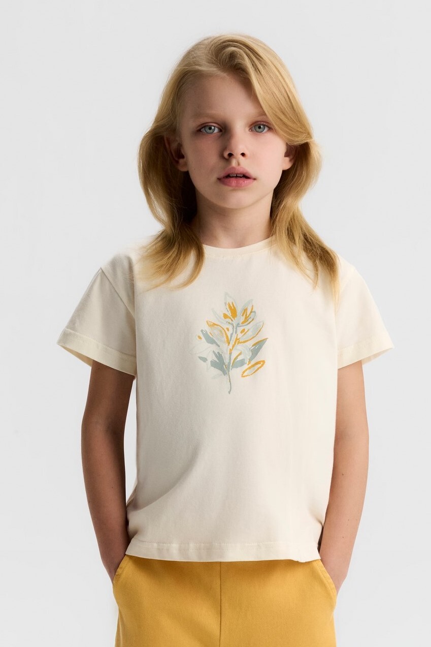 Bu kız çocuk tişörtü, bahar mevsimi için ideal olan krem rengiyle zarif ve sade bir görünüm sunuyor. Kısa kollu ve bisiklet yaka tasarımıyla rahat bir kullanım sağlarken, ön kısmındaki pastel tonlarda sarı ve mavi yaprak desenleri tişörte doğal bir hava katıyor. Günlük ve casual tarzları seven küçükler için mükemmel bir seçim.