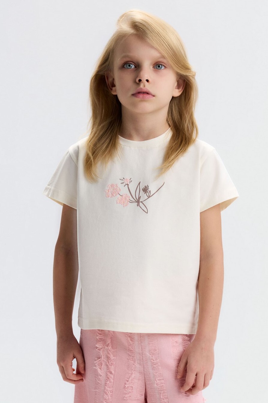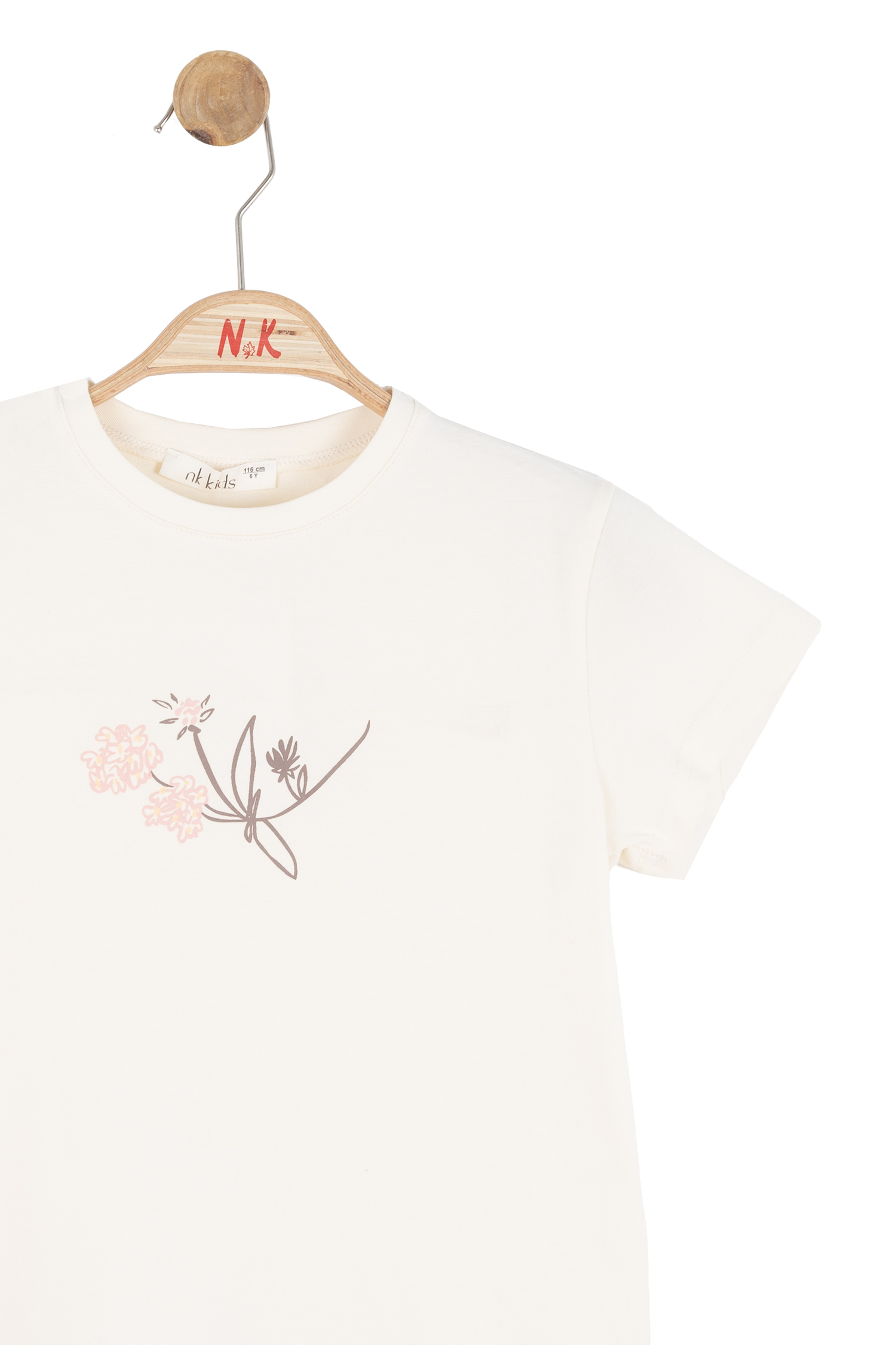 Bu krem rengi kız çocuk tişörtü, bahar ayları için ideal hafif ve rahat bir seçenektir. Sıfır yaka tasarımı ve kısa kollu yapısı sayesinde hareket özgürlüğü sunar. Tişörtün ön yüzünde zarif, pastel pembe ve kahverengi tonlarında minimalist bir çiçek deseni yer alır. Düz kesimi ve sade şıklığı ile günlük kullanıma uygundur.