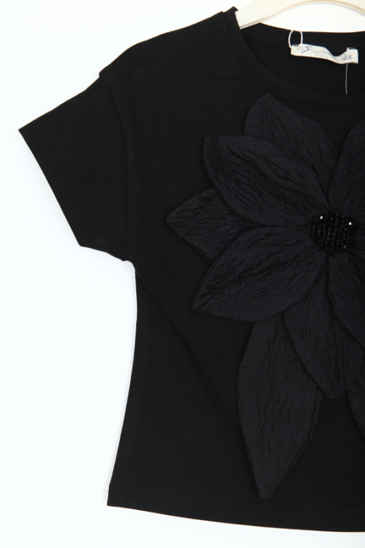 تتميز هذه البلوزة السوداء للبنات بأكمام قصيرة وياقة دائرية كلاسيكية توفر مظهرًا مريحًا وأنيقًا. تحتوي البلوزة على تصميم زهرة بارز وذو ملمس على الجزء الأمامي، مع زخارف من الخرز في مركز الزهرة تضيف لمسة من الجمال. تتميز البلوزة بقصّة مستقيمة تناسب الاستخدام اليومي. تفاصيلها البسيطة والجذابة تجعلها مفضلة للأطفال.