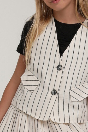 Kız çocuklar için şık ve rahat bir tişört modeli. Bu tişört, zarif bir çizgili desenle tasarlanmış olup, yaz günlerinde konfor sağlamak için idealdir.