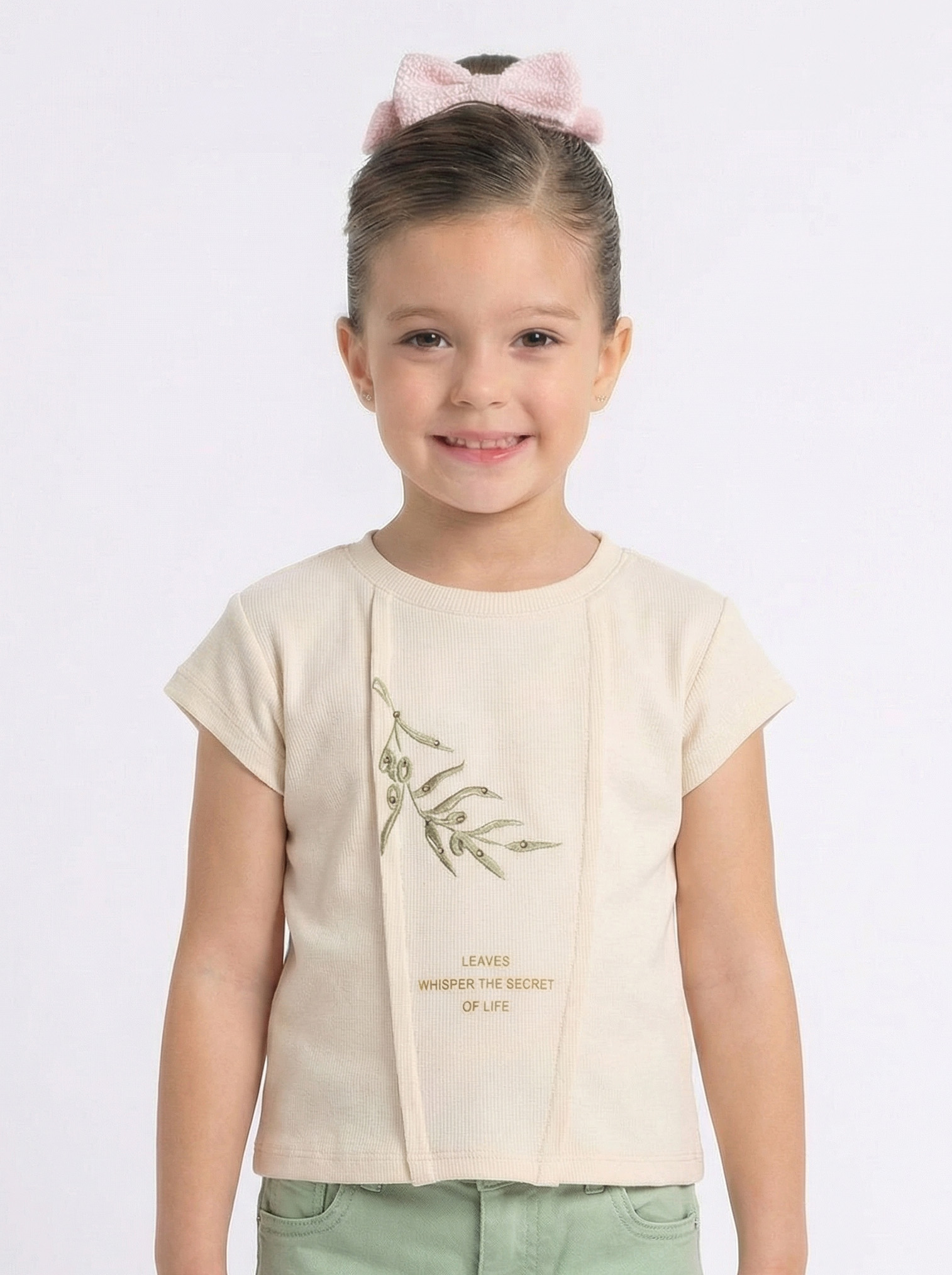 هذا التي شيرت الأنيق للفتيات يقدم أناقة مريحة لأيام الصيف. مصنوع من قماش ناعم وخفيف، يضمن لطفلك الشعور بالراحة طوال اليوم. يضيف الطباعة الأنيقة للأوراق والتفاصيل اللامعة لمسة فريدة للتي شيرت.