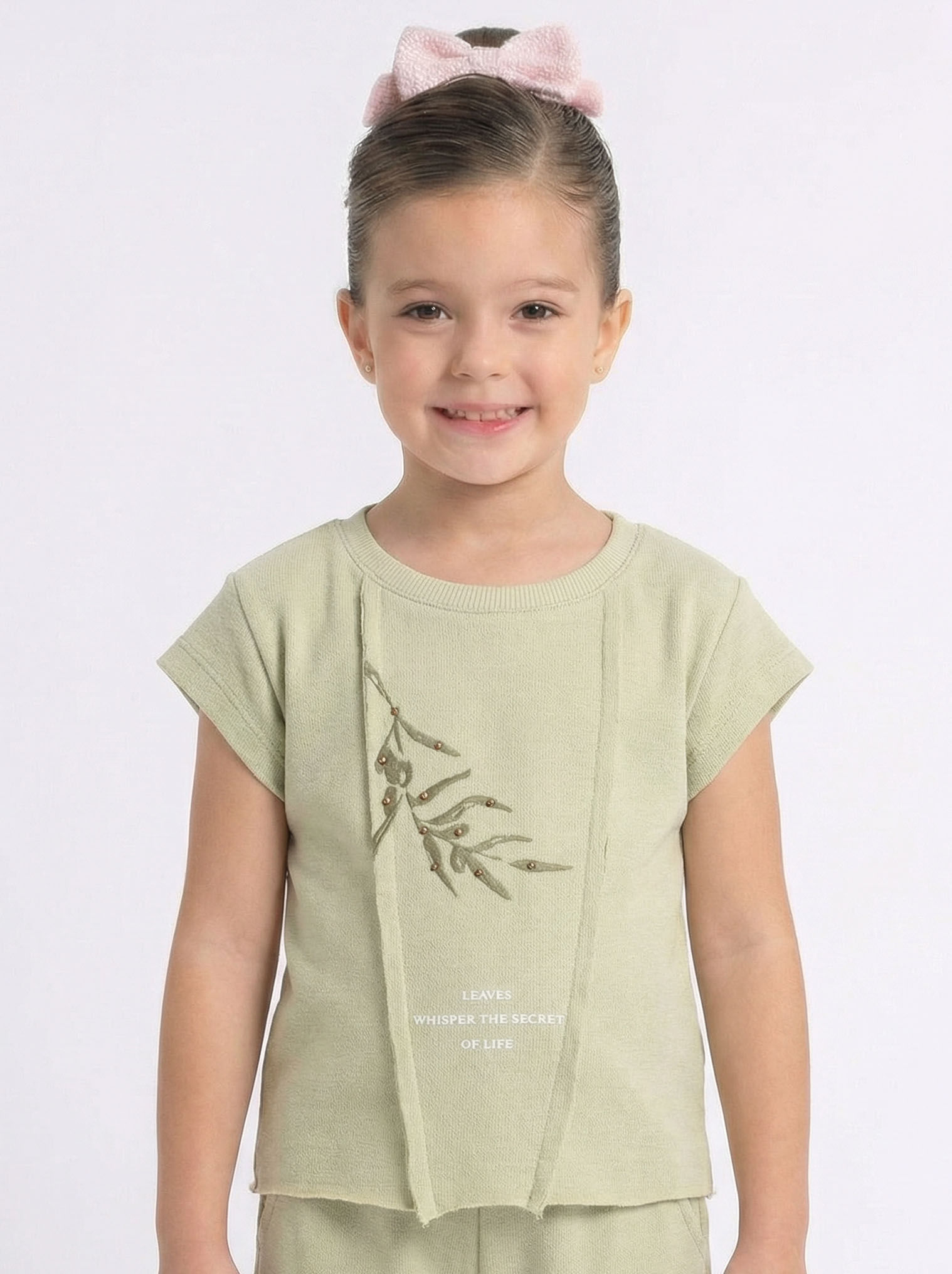 هذا التي شيرت الأنيق للفتيات يقدم أناقة مريحة لأيام الصيف. مصنوع من قماش ناعم وخفيف، يضمن لطفلك الشعور بالراحة طوال اليوم. يضيف الطباعة الأنيقة للأوراق والتفاصيل اللامعة لمسة فريدة للتي شيرت.