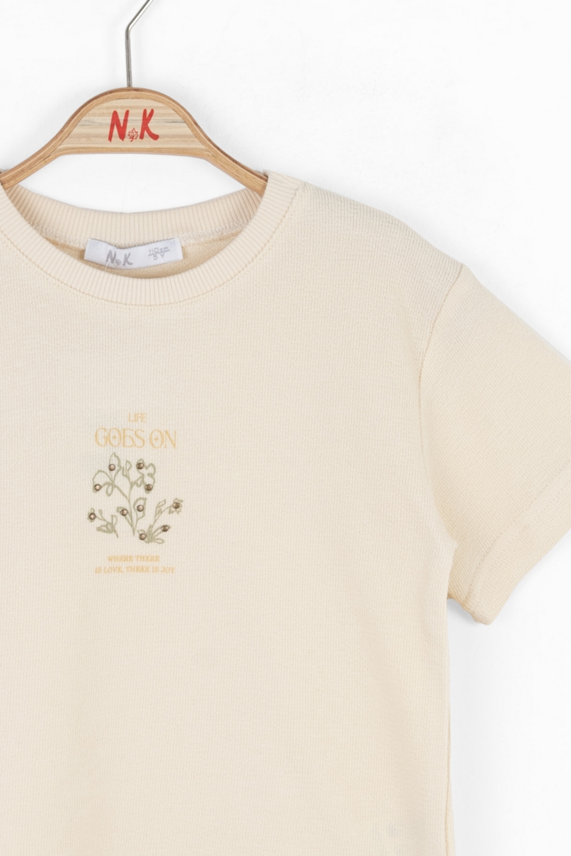 Bu kız çocuk tişörtü, sade ve zarif tasarımıyla günlük kullanım için ideal bir parçadır. Krem rengiyle her kıyafetle kolayca kombinlenebilir. Kısa kollu ve bisiklet yaka yapısı sayesinde rahat bir kullanım sunar. Ön yüzünde minimal bir çiçek baskısı ve "Life Goes On" yazısı yer almakta, bu da tişörte hem anlam hem de görsel şıklık katmaktadır. Yumuşak dokusu ve kaliteli kumaşı, çocukların hassas cildine dosttur.